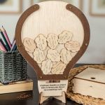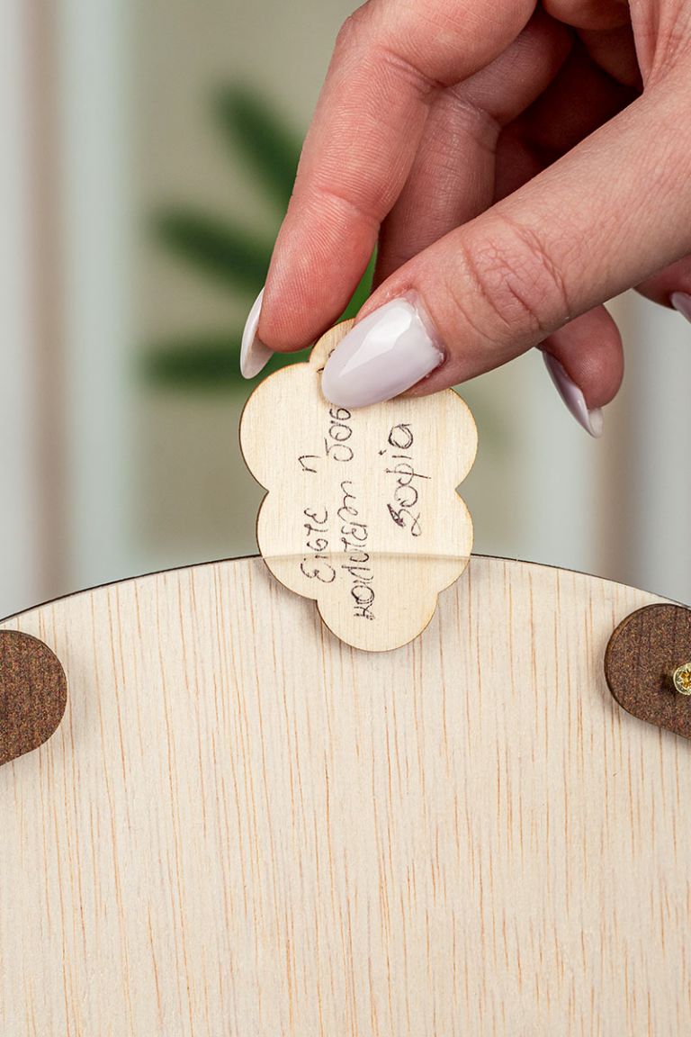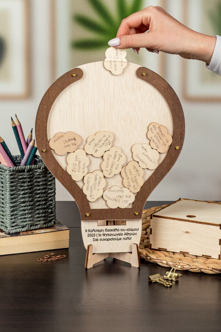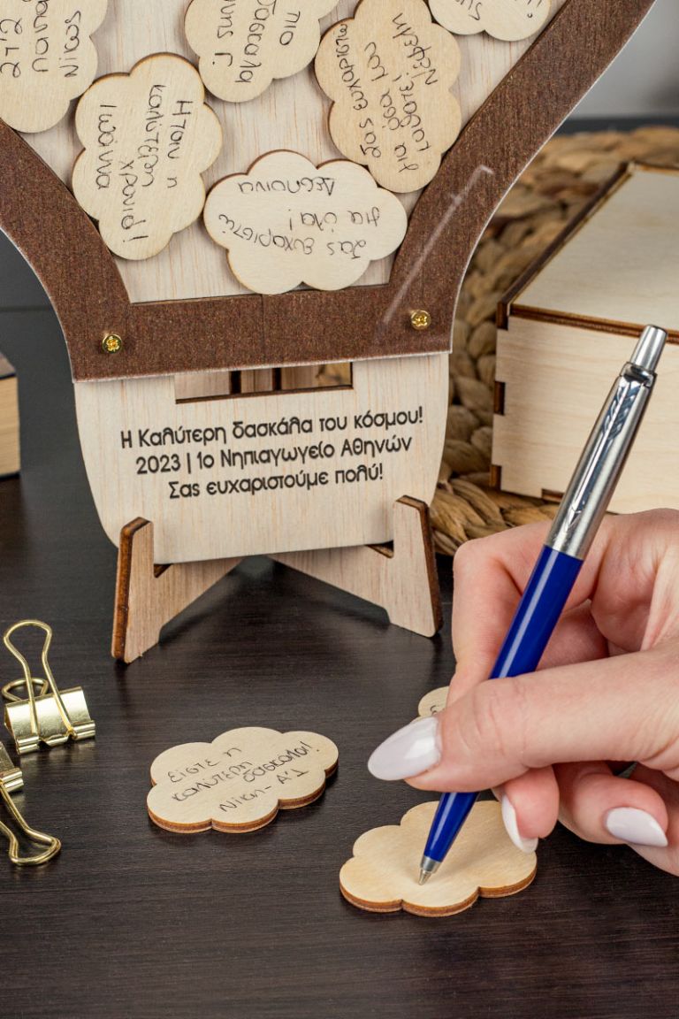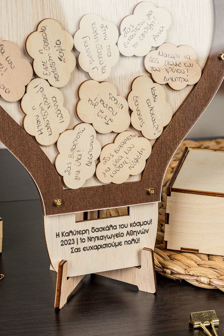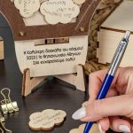 Η ξύλινη κατασκευή λειτουργεί όπως ένας “κουμπαράς ευχών”. Προσωποποιήστε το ευχολόγιο με όνομα και ευχές / τάξη / σχολείο .