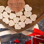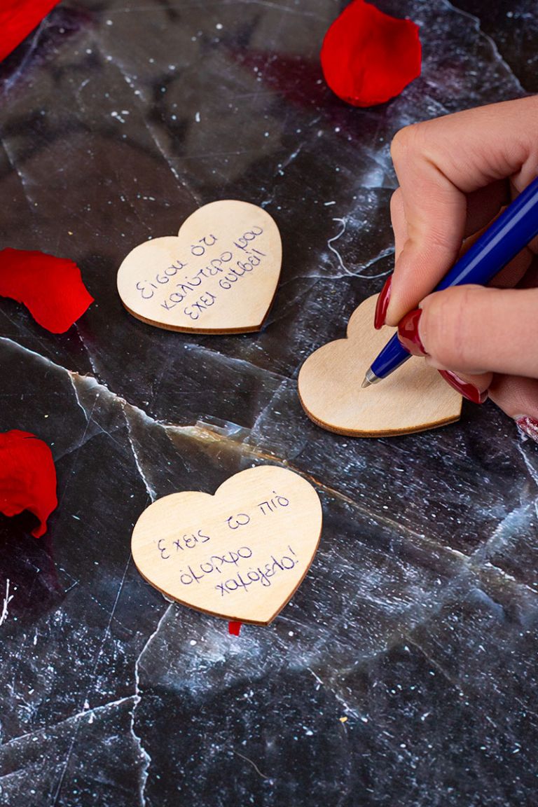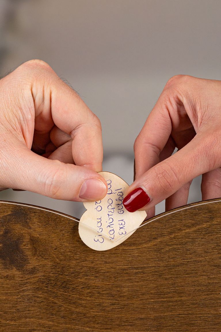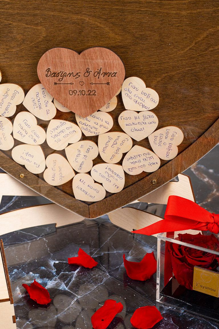 Η ξύλινη κατασκευή λειτουργεί όπως ένας “κουμπαράς αγάπης”. Προσωποποιήστε το ευχολόγιο με ονόματα & ημερομηνία .
