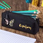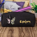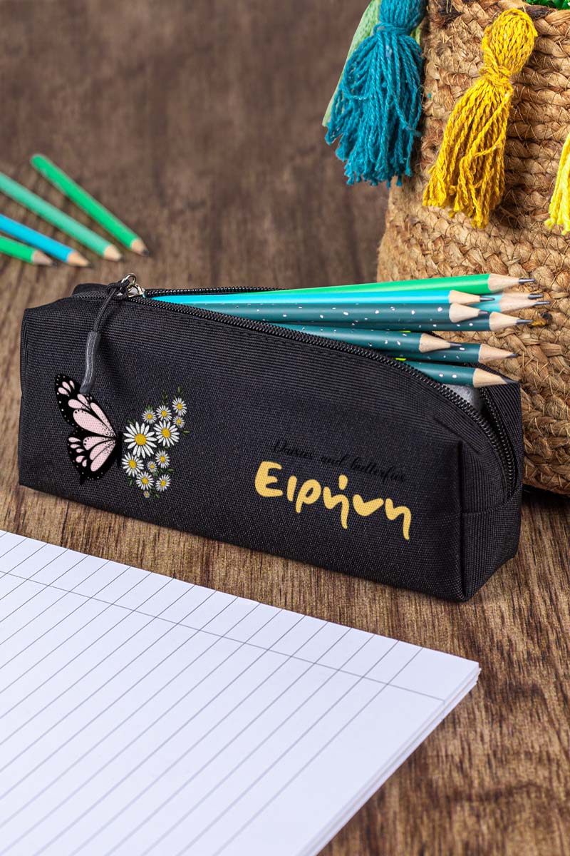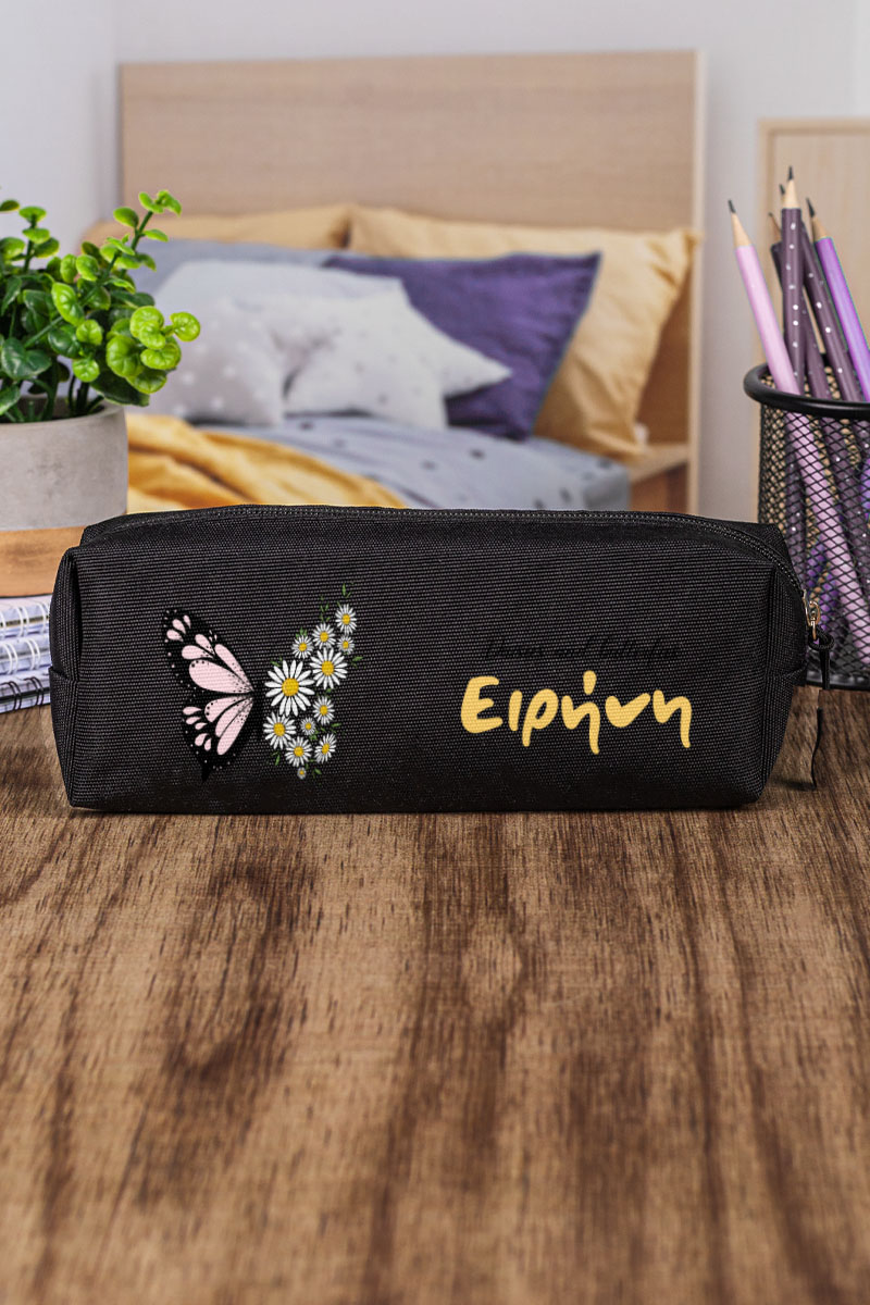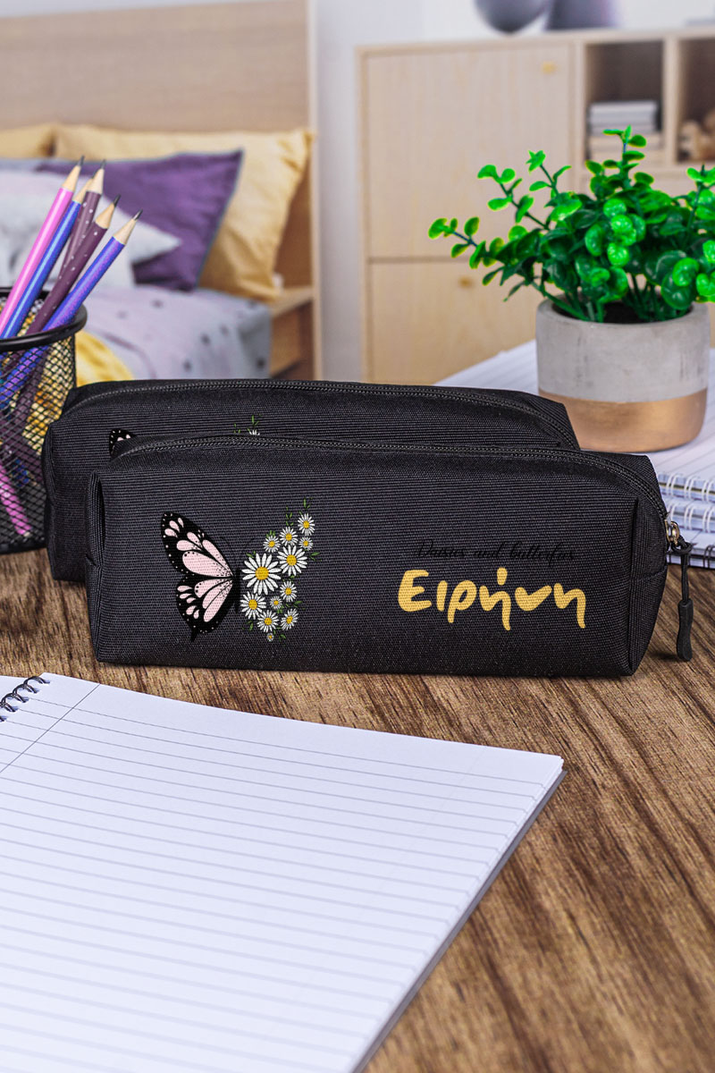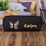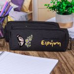 Σχολική Κασετίνα με Όνομα, σε Μαύρο Χρώμα & Σχέδιο Butterfly Flower