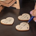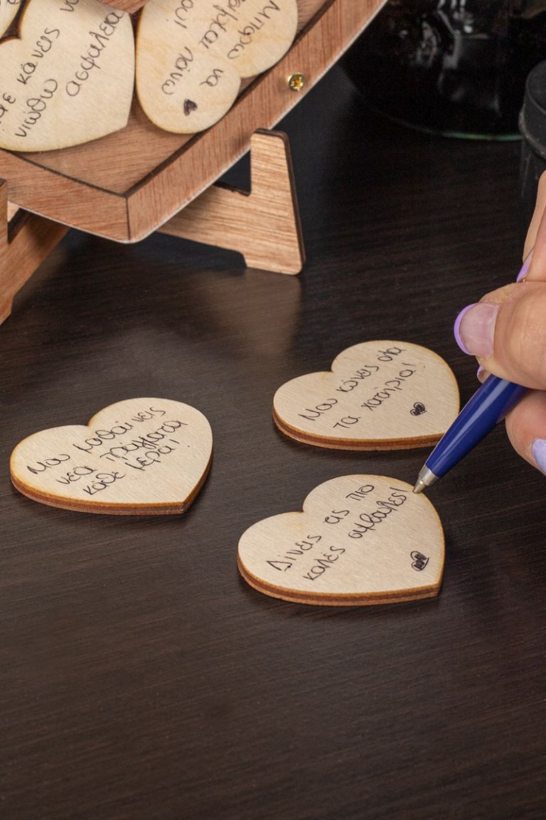 Η ξύλινη κατασκευή λειτουργεί όπως ένας “κουμπαράς αγάπης”. Προσωποποιήστε το ευχολόγιο με την αφιέρωση που επιθυμείς.