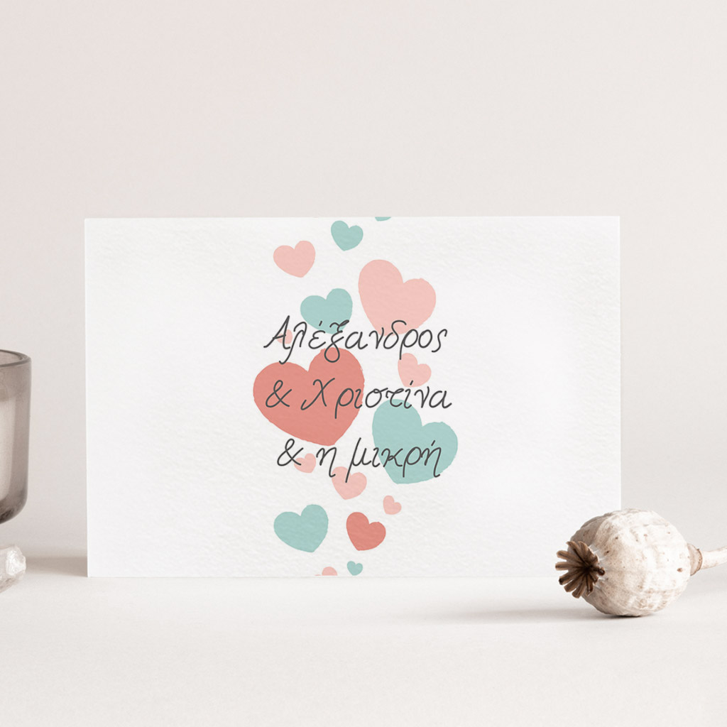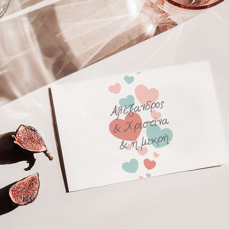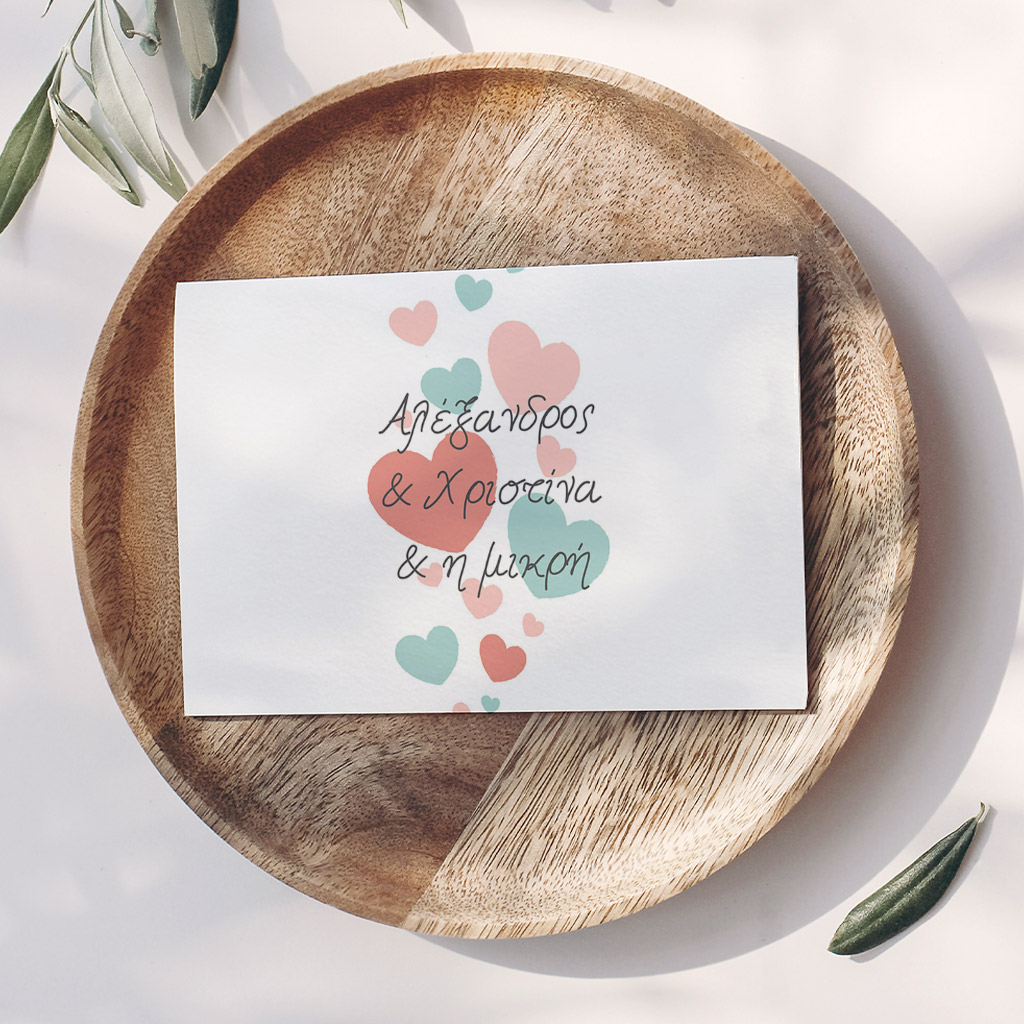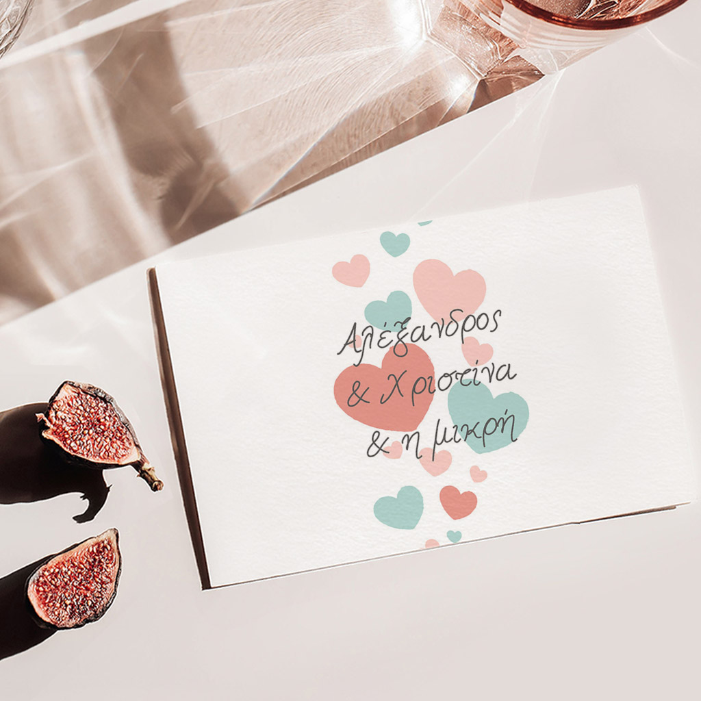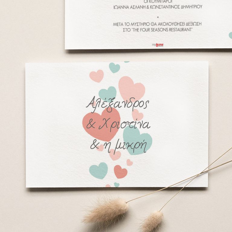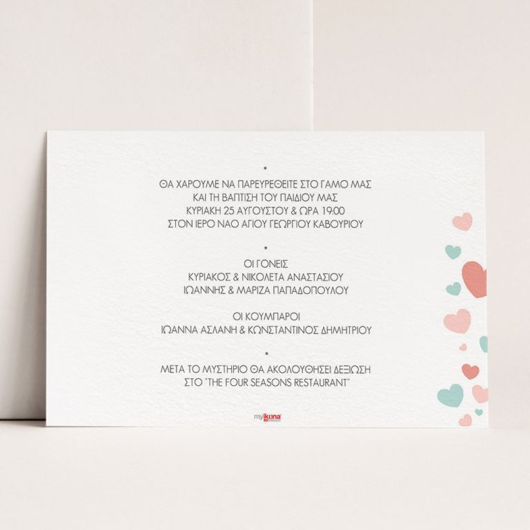 • Διακόσμηση & Σχεδίαση: Πολύχρωμες καρδιές στολίζουν και τις δύο όψεις του προσκλητηρίου, τονίζοντας την αγάπη που συμβολίζει αυτή η ξεχωριστή πρόσκληση.