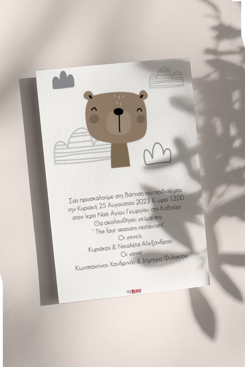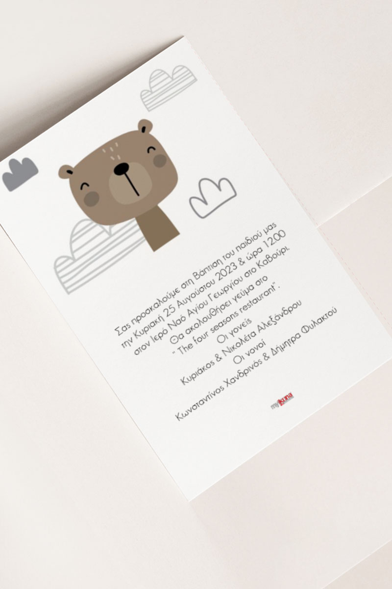 Κάθε λεπτομέρεια μετράει στην πιο όμορφη στιγμή της ζωής σας. Αυτό αντικατοπτρίζεται στα Προσκλητήρια Βάπτισης με σχέδιο Boho Αρκουδάκι, τα οποία χρησιμοποιούν υψηλής ποιότητας ιταλικό χαρτί και Myikona High Definition εκτύπωση. Διαθέσιμα σε διαφορετικές διαστάσεις.