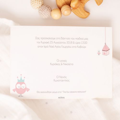 Αποκτήστε τα προσκλητήρια βάπτισης με σχέδιο Owls. Κατάλληλα για αγόρι ή κορίτσι, ξεχωρίζουν για το ανθεκτικό και ποιοτικό χαρτί τύπου Opalina και την εξαιρετική Myikona High Definition εκτύπωση. Δημιουργήστε εύκολα, γρήγορα και οικονομικά τα δικά σας προσκλητήρια!