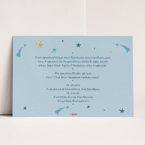 Κάθε λεπτομέρεια μετράει στην πιο όμορφη στιγμή της ζωής σας. Αυτό αντικατοπτρίζεται στα Προσκλητήρια Βάπτισης για αγόρι με σχέδιο Spaceboy, τα οποία χρησιμοποιούν υψηλής ποιότητας ιταλικό χαρτί και Myikona High Definition εκτύπωση. Διαθέσιμα σε διαφορετικές διαστάσεις.