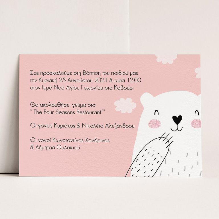 Κάθε λεπτομέρεια μετράει στην πιο όμορφη στιγμή της ζωής σας. Αυτό αντικατοπτρίζεται στα Προσκλητήρια Βάπτισης με σχέδιο Αρκουδάκι σε Γαλάζιο Ουρανό, τα οποία χρησιμοποιούν υψηλής ποιότητας ιταλικό χαρτί και Myikona High Definition εκτύπωση. Διαθέσιμα σε διαφορετικές διαστάσεις.