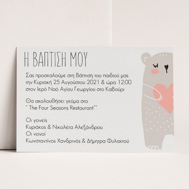 Κάθε λεπτομέρεια μετράει στην πιο όμορφη στιγμή της ζωής σας. Αυτό αντικατοπτρίζεται στα Προσκλητήρια Βάπτισης για αγόρι με σχέδιο Λούτρινο Αρκουδάκι, τα οποία χρησιμοποιούν υψηλής ποιότητας ιταλικό χαρτί και Myikona High Definition εκτύπωση. Διαθέσιμα σε διαφορετικές διαστάσεις.