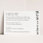 Δημιουργήστε μια πρόσκληση με τα στοιχεία σας και επιλέξτε ποσότητα 1 ώστε να δημιουργήσουμε ένα προσκλητήριο και να σας το αποστείλουμε πριν την τελική εκτύπωση με κόστος μόνο 9,95€.