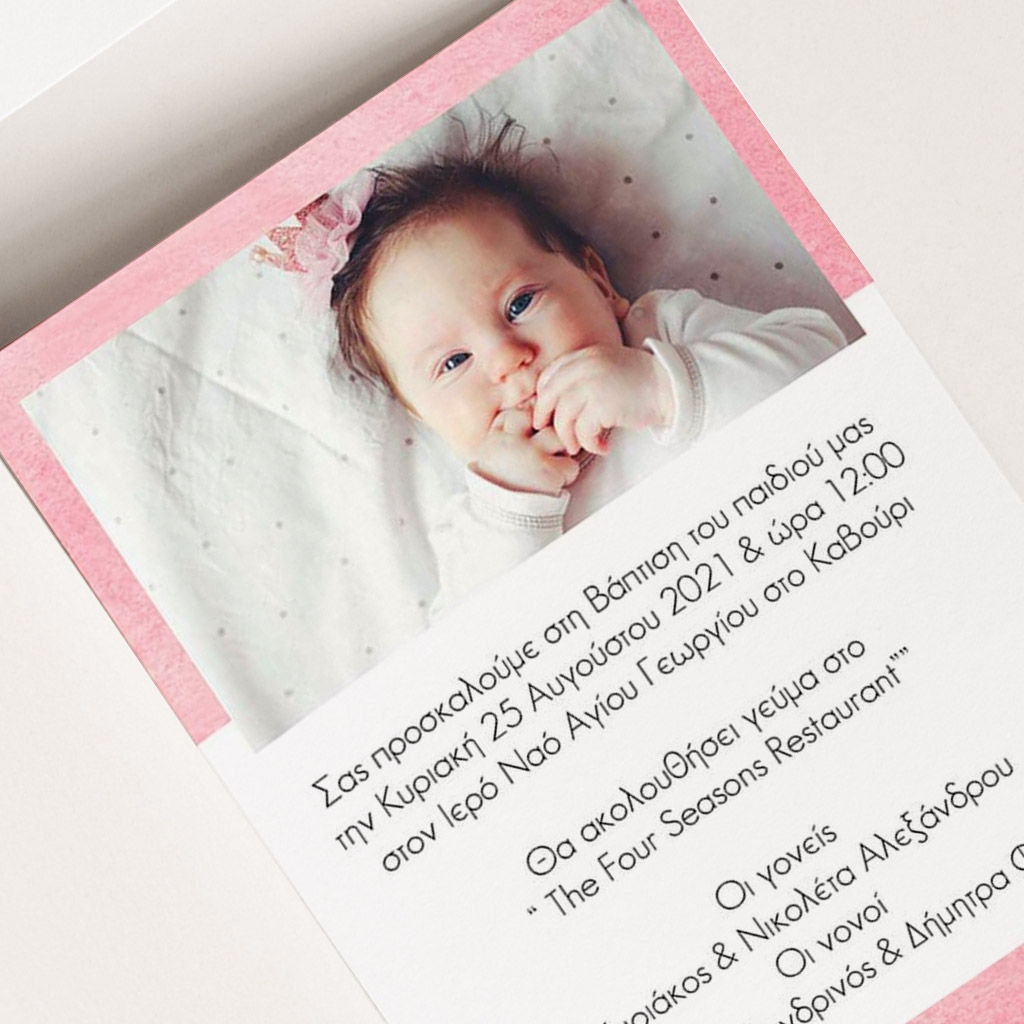 Κάθε λεπτομέρεια μετράει στην πιο όμορφη στιγμή της ζωής σας. Αυτό αντικατοπτρίζεται στα Προσκλητήρια Βάπτισης με σχέδιο Boho Ροζ Λουλούδια, τα οποία χρησιμοποιούν υψηλής ποιότητας ιταλικό χαρτί και Myikona High Definition εκτύπωση. Διαθέσιμα σε διαφορετικές διαστάσεις.