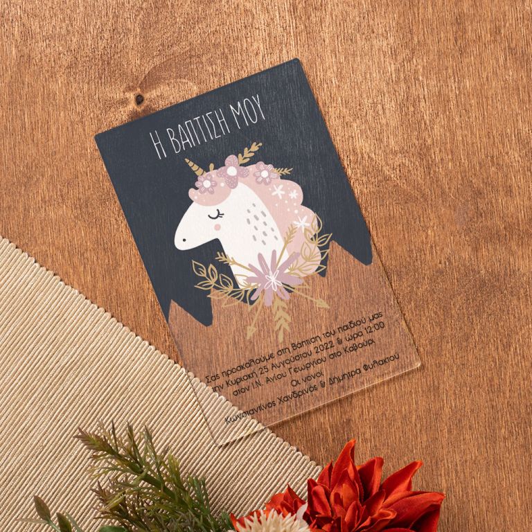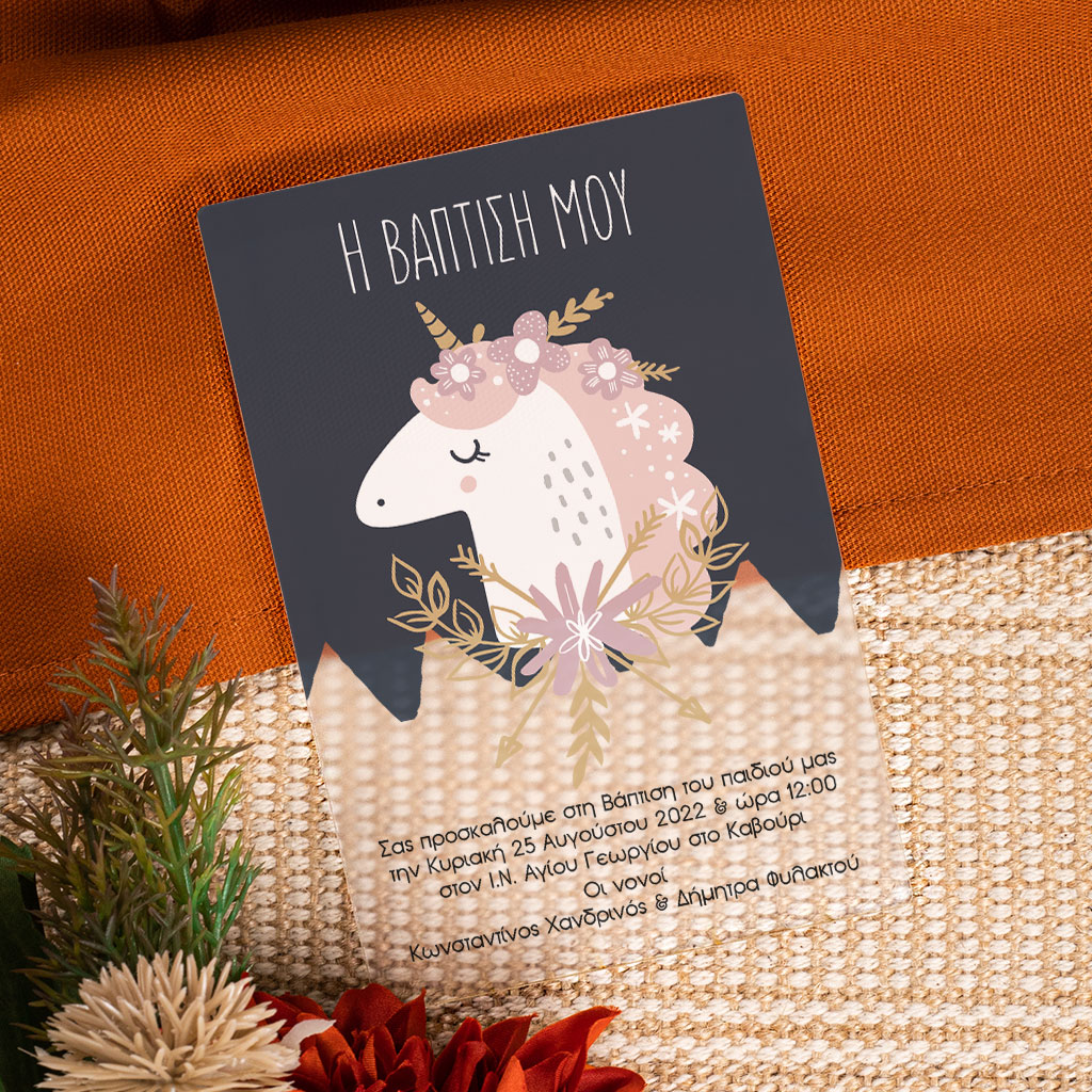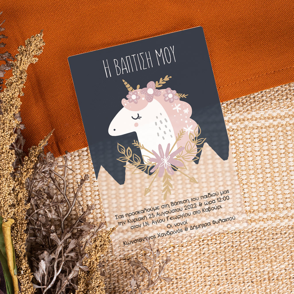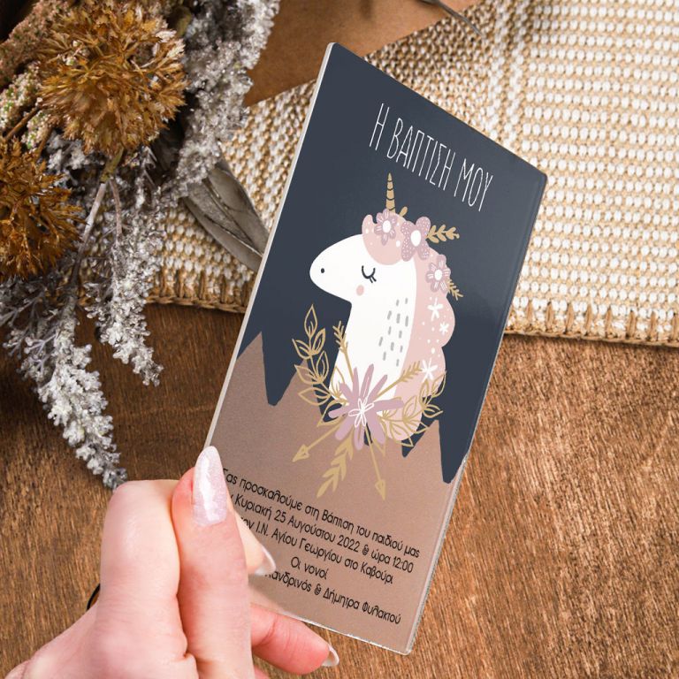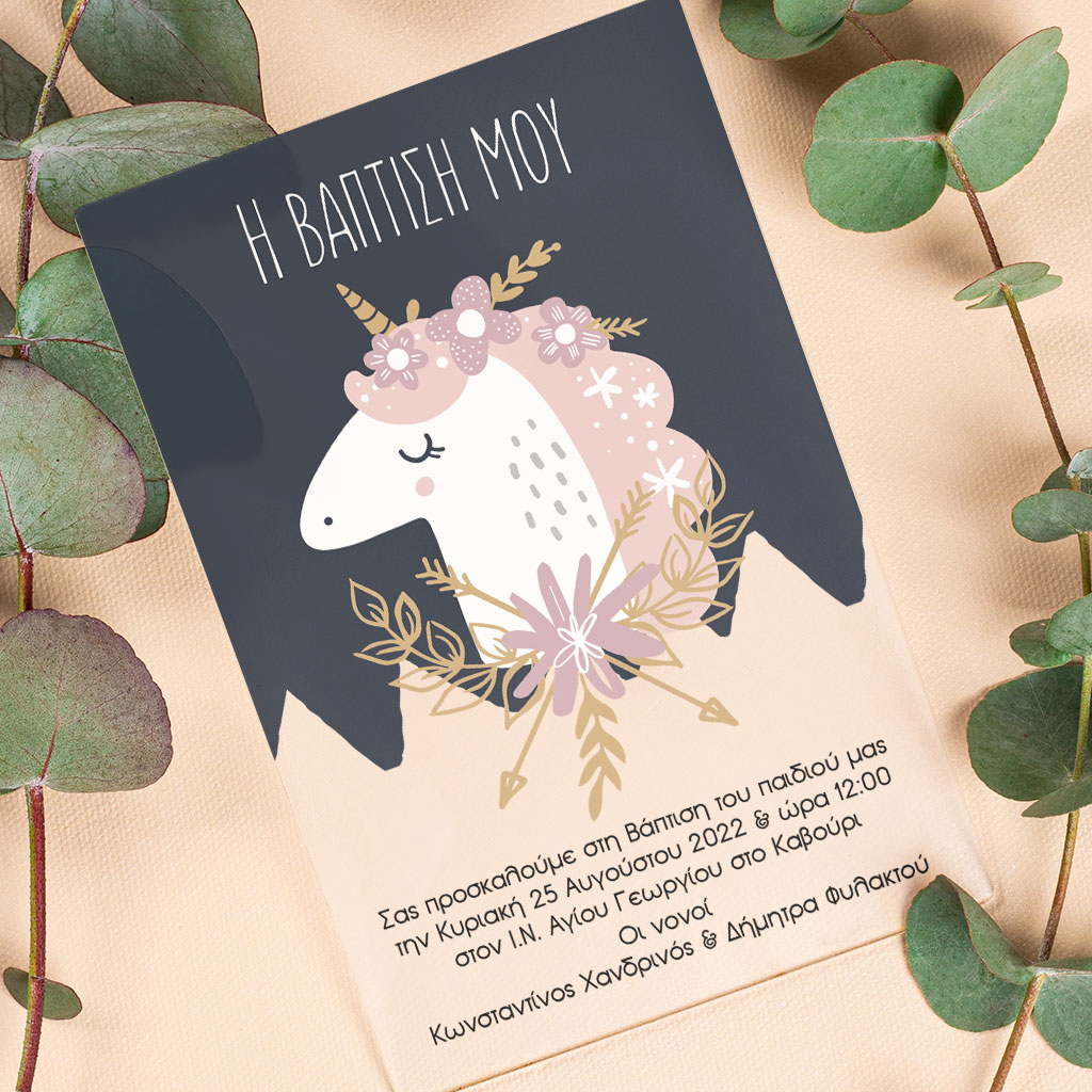 Πρόσκληση Βάπτισης με Σχέδιο Unicorn Baby