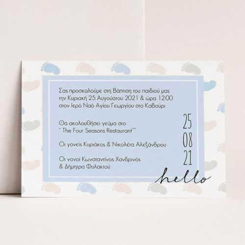 Ο τρόπος με τον οποίο μπορείτε να δημιουργήσετε online τα δικά σας προσκλητήρια Βάπτισης είναι πιο εύκολος και γρήγορος από ποτέ. Προσθέστε στην πρόσκλησή του αγοριού σας ή του κοριτσιού σας κείμενα, γραφικά και πολλά άλλα. Σε λίγα λεπτά, μπορείτε να παραγγείλετε τα προσκλητήριά σας και σε ελάχιστες ημέρες να τα παραλάβετε στο χώρο σας !
