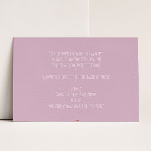 Προσκαλέστε επίσημα τους φίλους, την οικογένεια και τους αγαπημένους σας στο μυστήριο της Βάπτισης του αγοριού σας ή του κοριτσιού σας με το ομορφότερο προσκλητήριο Βάπτισης! Είτε πρόκειται για μια vintage ή ρομαντική Βάπτιση στην Αθήνα, είτε για μια πρωτότυπη Βάπτιση στη Θεσσαλονίκη, θα δημιουργήσετε μια μοναδική πρόσκληση ακριβώς όπως την έχετε ονειρευτεί