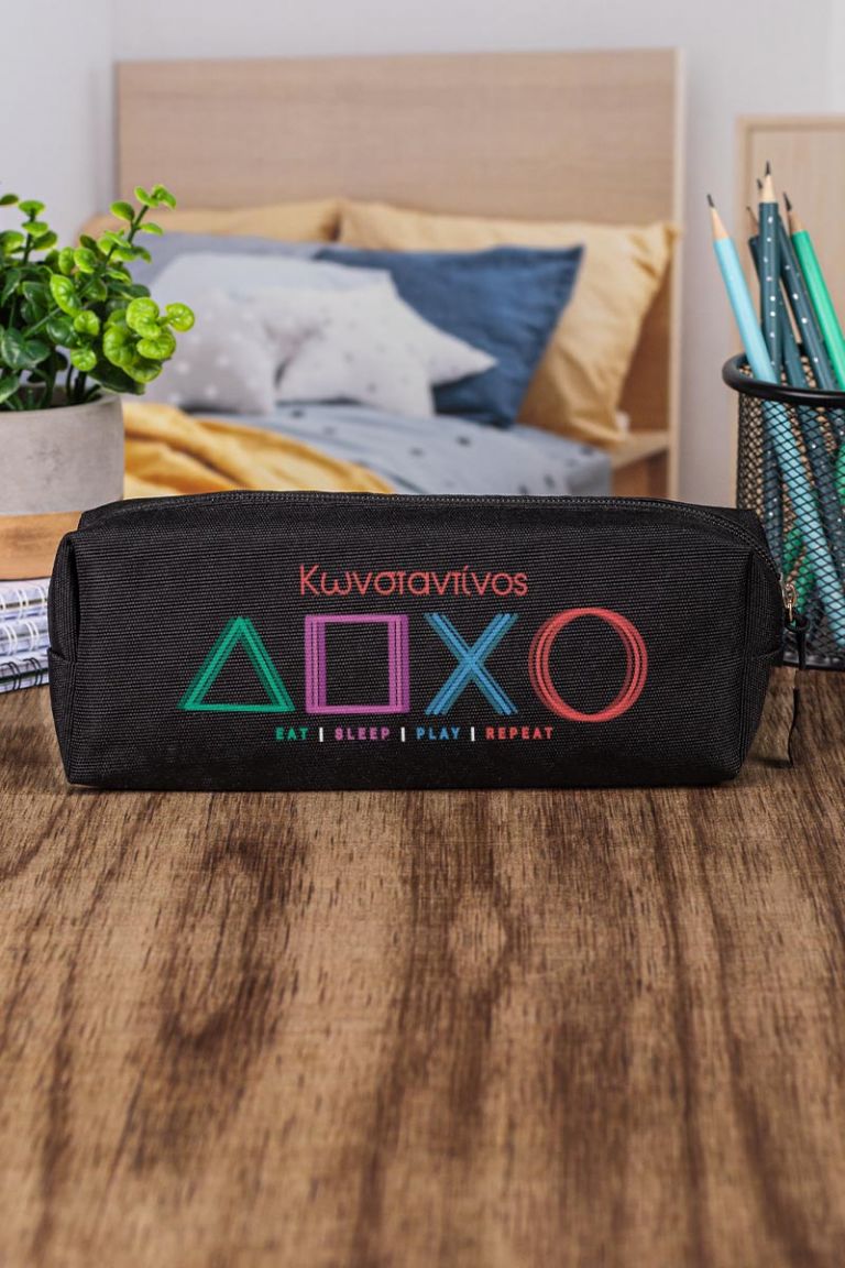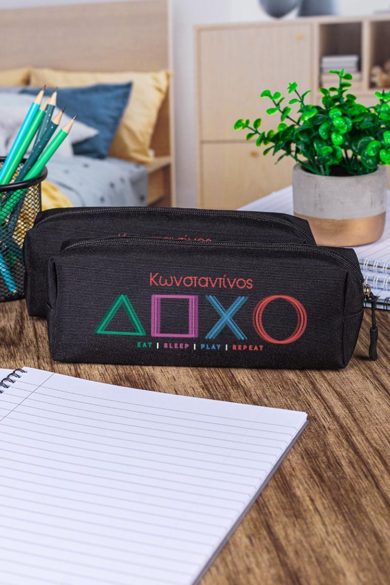 Σχολική Κασετίνα με Όνομα, σε Μαύρο Χρώμα & Σχέδιο Eat Sleep Play