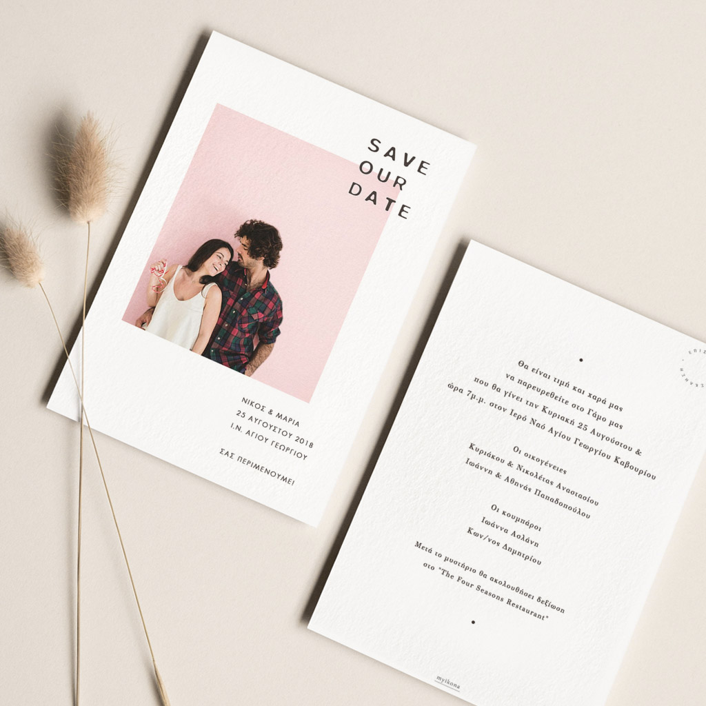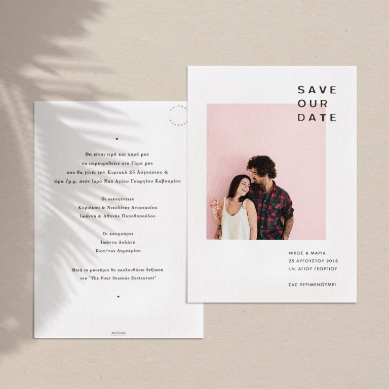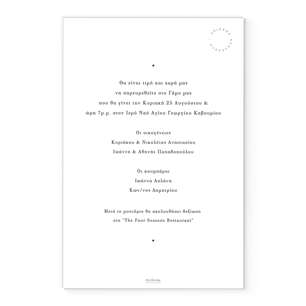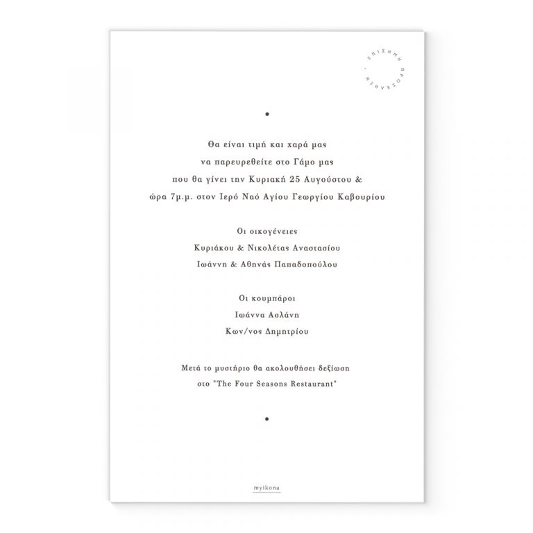 Αποκτήστε τα προσκλητήρια γάμου με σχέδιο Minimal Elegance. Οι πελάτες μας τα ξεχωρίζουν για το υψηλής ποιότητας ιταλικό χαρτί και την εκτύπωση υψηλής ευκρίνειας Myikona High Definition. Διαθέσιμα σε διαφορετικές διαστάσεις.