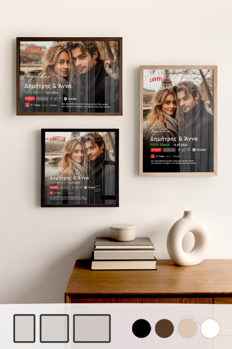 Κάνουμε πιο εύκολο από ποτέ τον τρόπο με τον οποίο μπορείτε να δημιουργήσετε online τα δικά σας έργα τέχνης. Προσθέστε στις κορνίζες σας μονογράμματα, κείμενα, λεζάντες και πολλά άλλα. Σε λίγα λεπτά, μπορείτε να παραγγείλετε ένα έργο τέχνης που θα μετατρέψει έναν συνηθισμένο τοίχο στο σημείο εστίασης οποιουδήποτε δωματίου. Μπορείτε να δημιουργήσετε κορνίζες με τις καθημερινές σας στιγμές, το Γάμο σας, τη Βάπτιση του παιδιού σας, τα ταξίδια σας, τις διακοπές σας, τις σημαντικές στιγμές σας και πολλά άλλα.