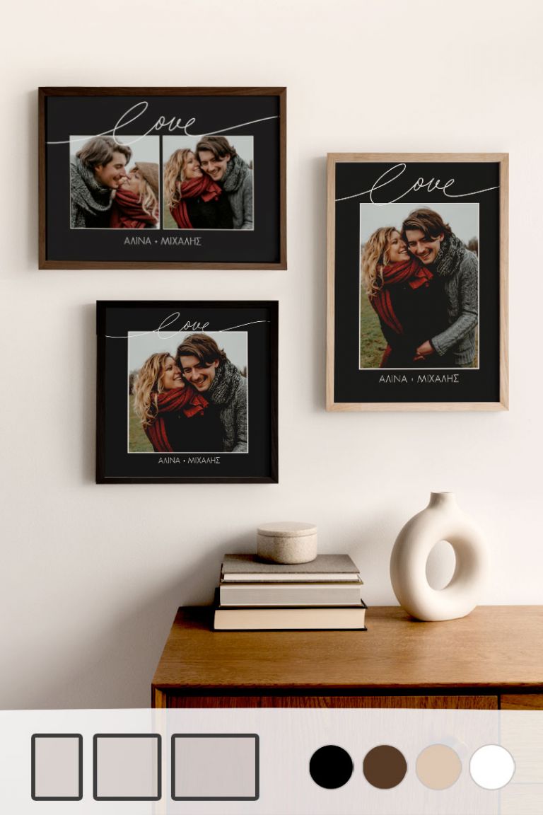 Κάνουμε πιο εύκολο από ποτέ τον τρόπο με τον οποίο μπορείτε να δημιουργήσετε online τα δικά σας έργα τέχνης. Προσθέστε στις κορνίζες σας μονογράμματα, κείμενα, λεζάντες και πολλά άλλα. Σε λίγα λεπτά, μπορείτε να παραγγείλετε ένα έργο τέχνης που θα μετατρέψει έναν συνηθισμένο τοίχο στο σημείο εστίασης οποιουδήποτε δωματίου. Μπορείτε να δημιουργήσετε κορνίζες με τις καθημερινές σας στιγμές, το Γάμο σας, τη Βάπτιση του παιδιού σας, τα ταξίδια σας, τις διακοπές σας, τις σημαντικές στιγμές σας και πολλά άλλα.
