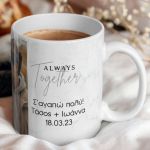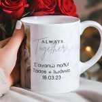 Η προσθήκη φωτογραφίας του ζευγαριού, ονομάτων ή αφιέρωσης προσδίδει στις κούπες μια προσωπική πινελιά. Κάθε φορά που θα απολαμβάνετε τον πρωινό σας καφέ ή το απογευματινό τσάι, θα ανακαλύπτετε ένα κομμάτι της αγάπης σας που ζει σε κάθε γωνιά της κούπας.