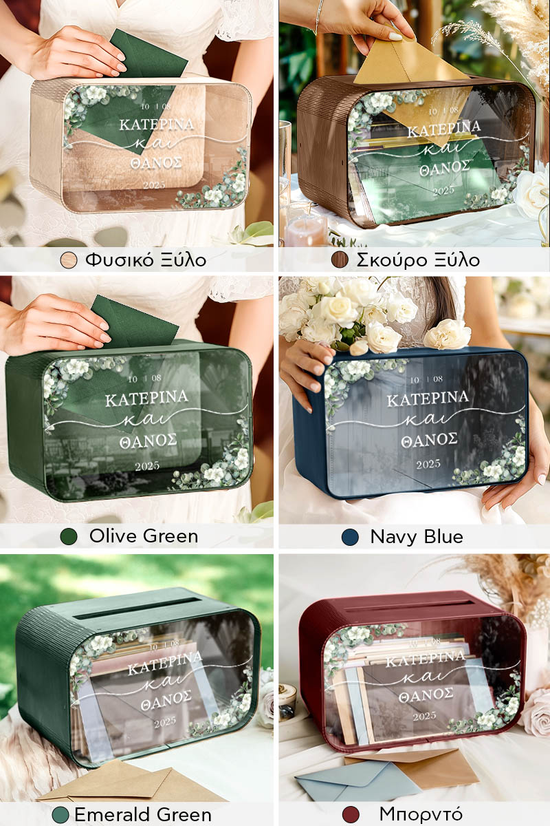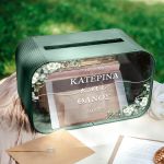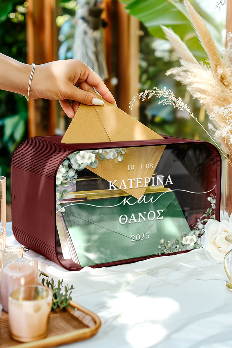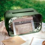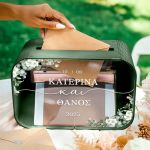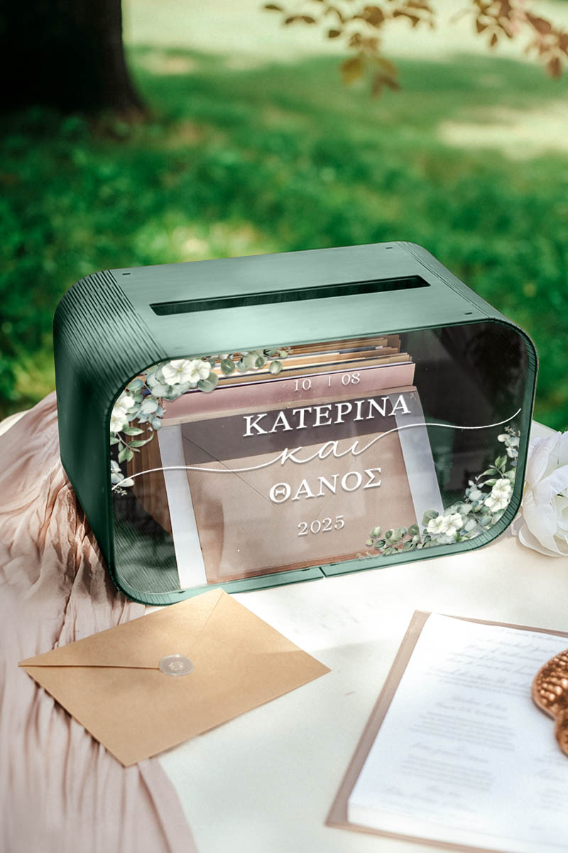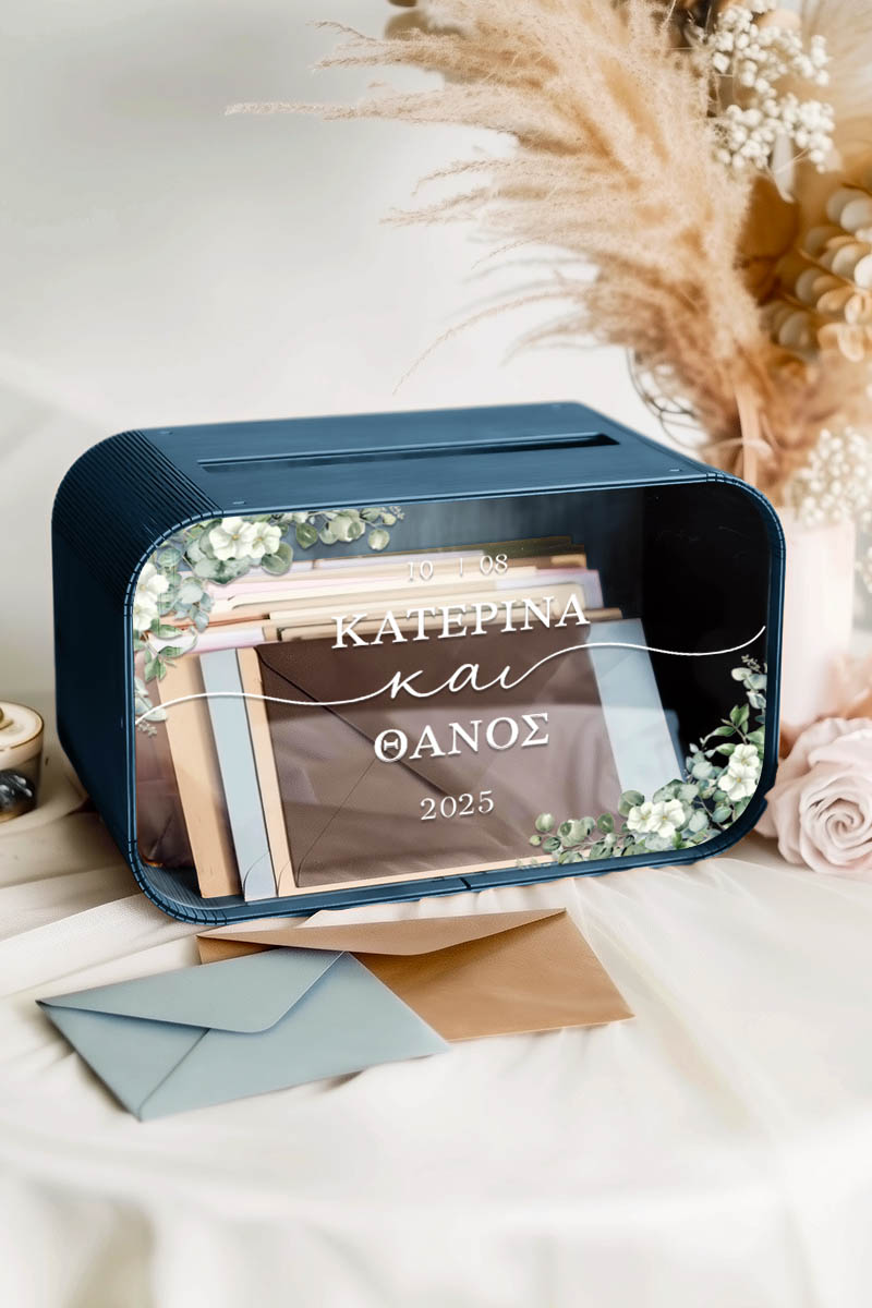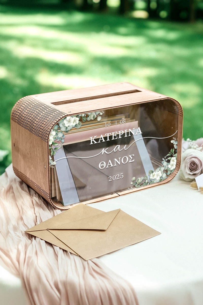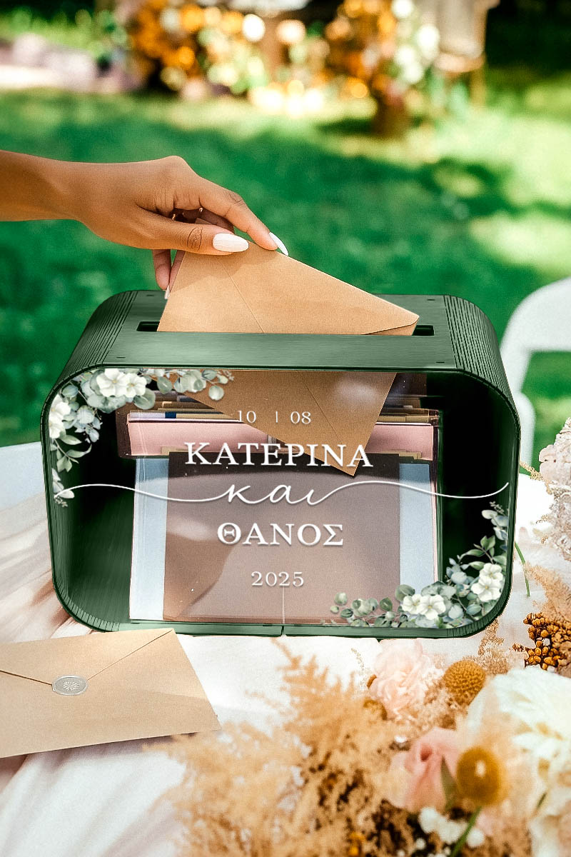 Το κουτί ευχών γάμου με ονόματα και ημερομηνία αποκτά προσωπικό χαρακτήρα και μετατρέπεται σε αναμνηστικό ζωής. Είναι ο πιο όμορφος τρόπος να διατηρήσετε τις ευχές όσων μοιράστηκαν μαζί σας αυτή τη σημαντική μέρα.