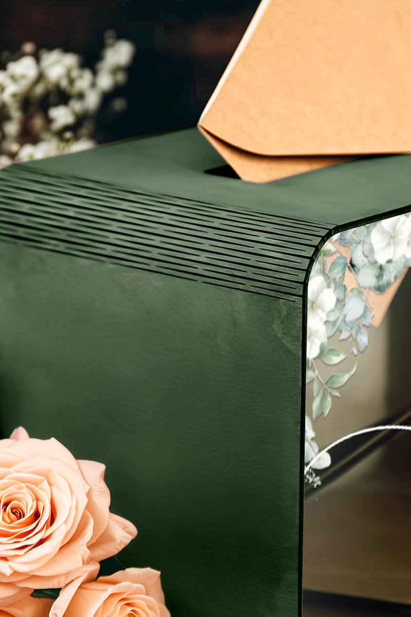 Η εξαιρετική ποιότητα των υλικών και η άψογη εκτύπωση στην πρόσοψη εξασφαλίζουν ένα άρτιο αισθητικό αποτέλεσμα. Χάρη στην προσοχή στη λεπτομέρεια, το κουτί ταιριάζει σε κάθε στολισμό γάμου, είτε κλασικό είτε μοντέρνο.