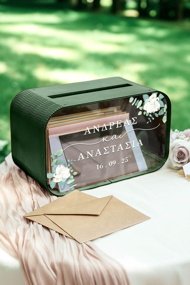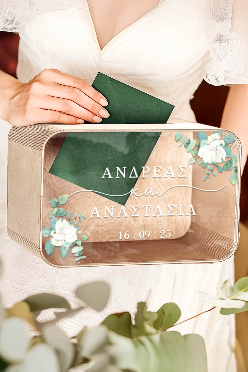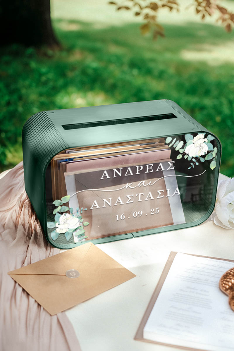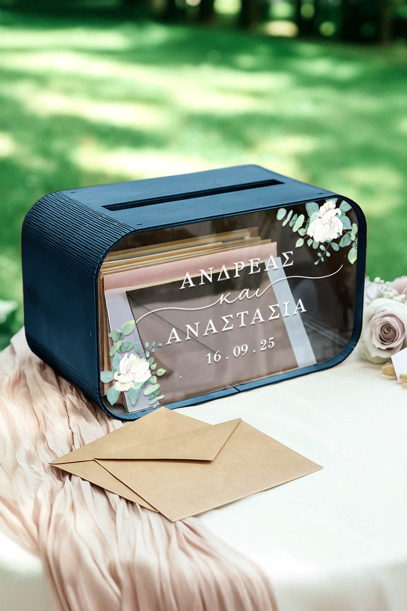 Το κουτί ευχών γάμου με ονόματα και ημερομηνία αποκτά προσωπικό χαρακτήρα και μετατρέπεται σε αναμνηστικό ζωής. Είναι ο πιο όμορφος τρόπος να διατηρήσετε τις ευχές όσων μοιράστηκαν μαζί σας αυτή τη σημαντική μέρα.