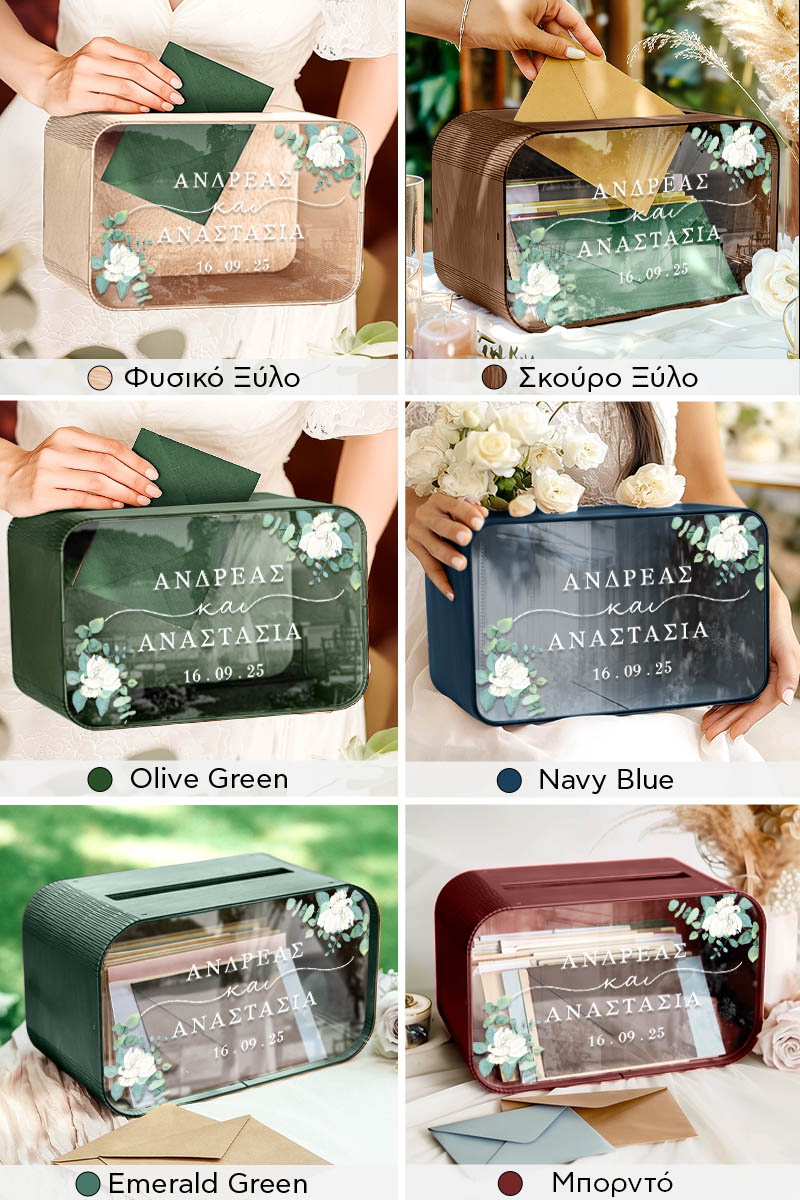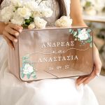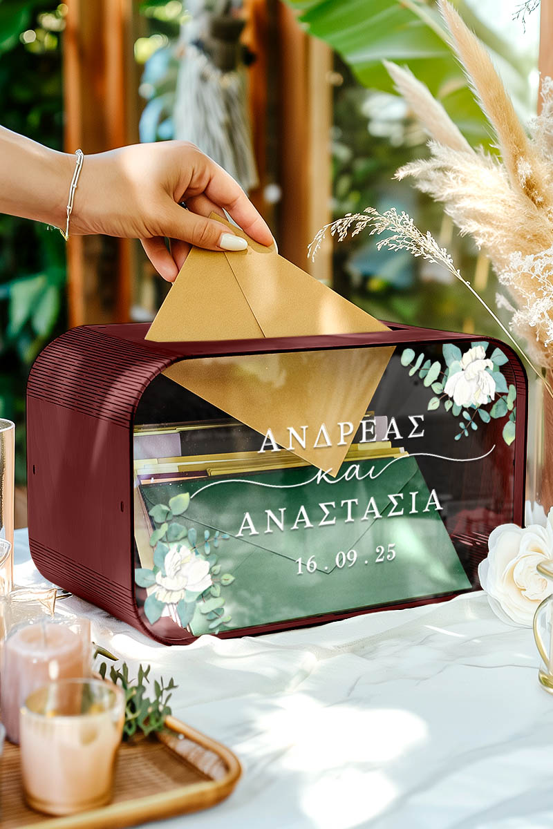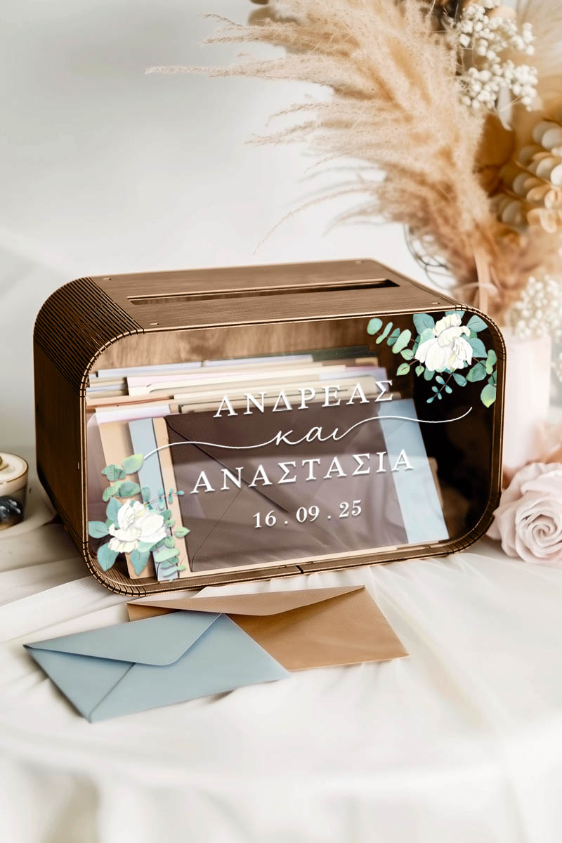Το κουτί ευχών γάμου με ονόματα και ημερομηνία αποκτά προσωπικό χαρακτήρα και μετατρέπεται σε αναμνηστικό ζωής. Είναι ο πιο όμορφος τρόπος να διατηρήσετε τις ευχές όσων μοιράστηκαν μαζί σας αυτή τη σημαντική μέρα.