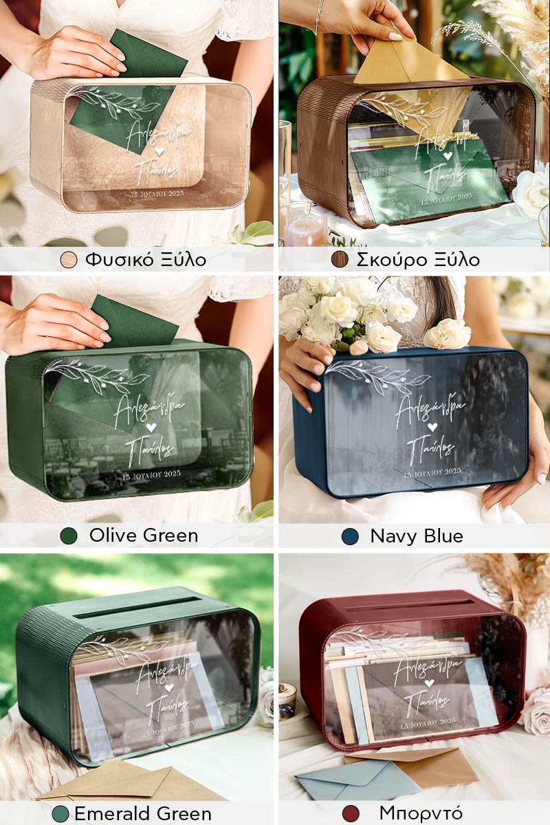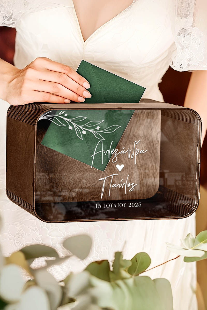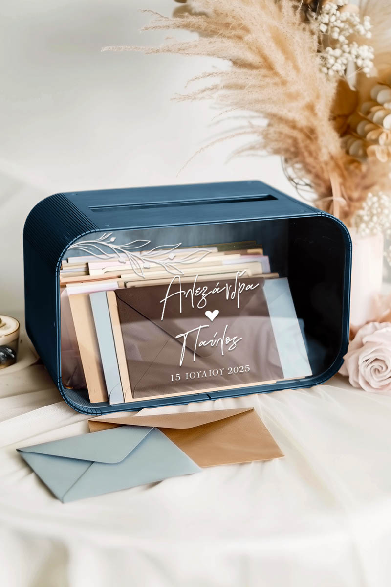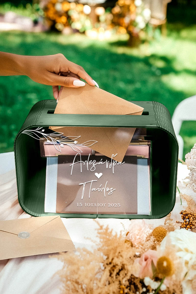 Το κουτί ευχών γάμου με ονόματα και ημερομηνία αποκτά προσωπικό χαρακτήρα και μετατρέπεται σε αναμνηστικό ζωής. Είναι ο πιο όμορφος τρόπος να διατηρήσετε τις ευχές όσων μοιράστηκαν μαζί σας αυτή τη σημαντική μέρα.