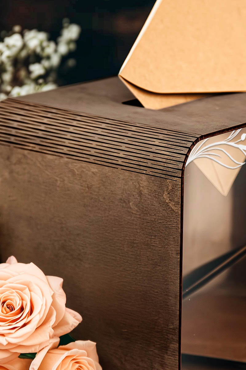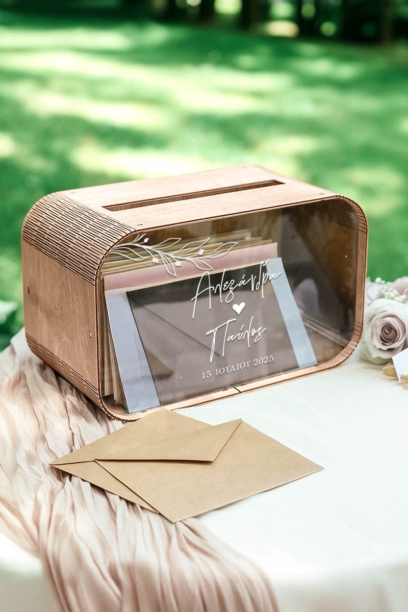 Το Κουτί Ευχών Γάμου αποτελεί μια εκλεπτυσμένη πρόταση για κάθε ζευγάρι που αναζητά έναν ξεχωριστό τρόπο να φυλάξει τις ευχές των καλεσμένων του. Κατασκευασμένο από premium κόντρα πλακέ, το κουτί λειτουργεί όπως ένας κουμπαράς, όπου οι καλεσμένοι ρίχνουν φακέλους με τις ευχές τους η τον φάκελο με το δώρο τους.