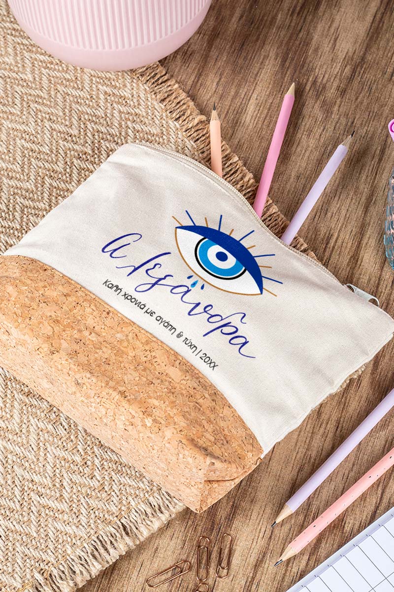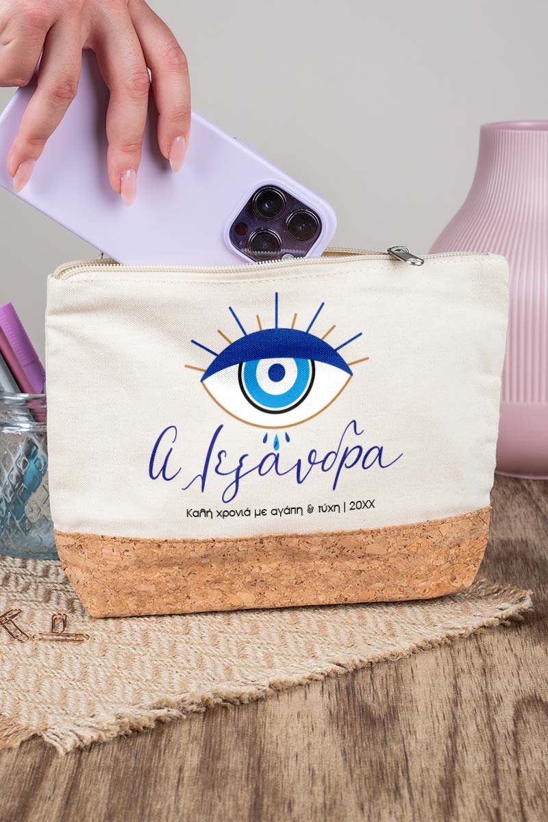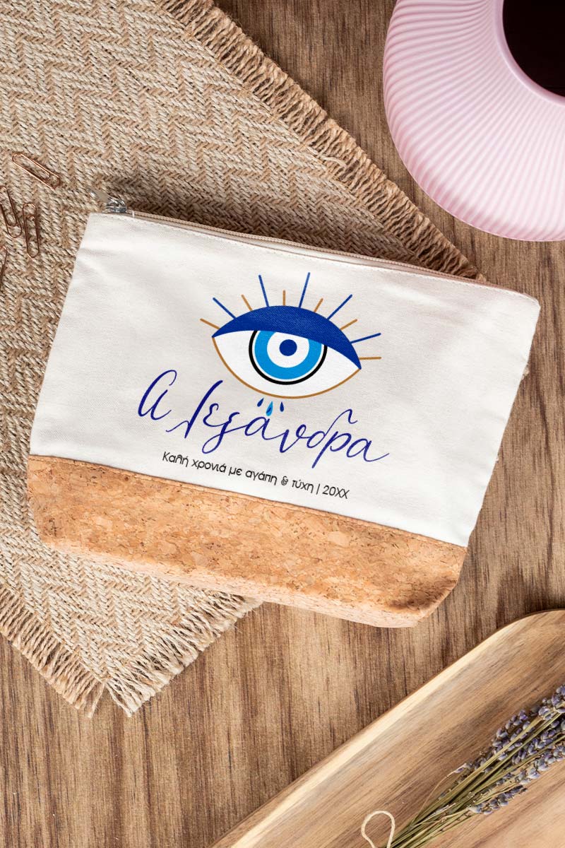 Μεγάλο Εκρού Τσαντάκι & Νεσεσέρ με Φελλό και Σχέδιο Μάτι