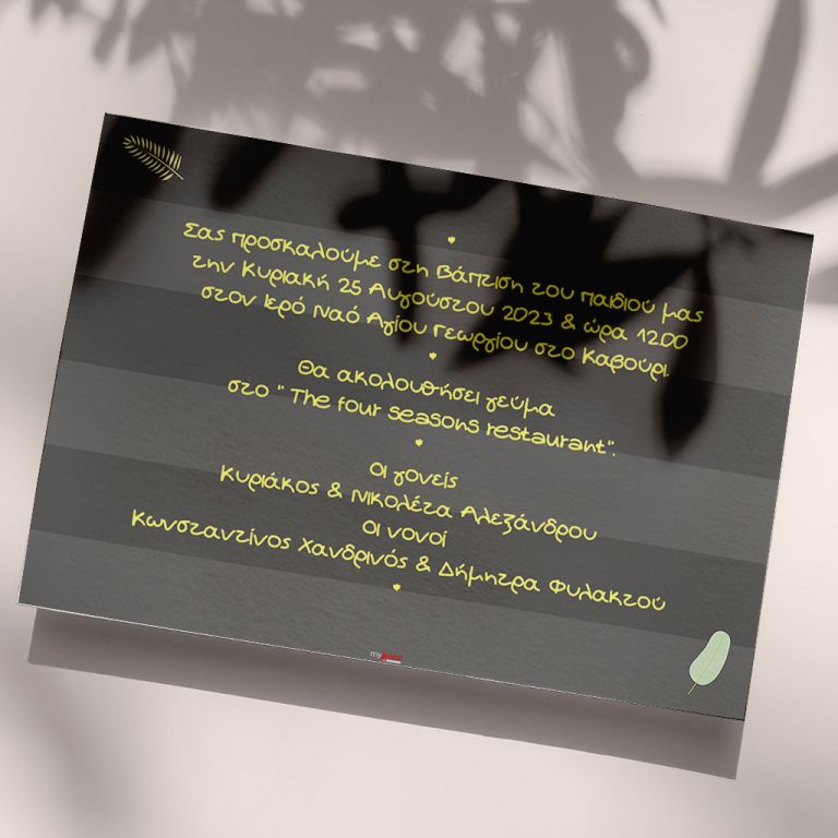 Κάθε λεπτομέρεια μετράει στην πιο όμορφη στιγμή της ζωής σας. Αυτό αντικατοπτρίζεται στα Προσκλητήρια Βάπτισης με σχέδιο Boho Ζωάκια της Ζούγκλας, τα οποία χρησιμοποιούν υψηλής ποιότητας ιταλικό χαρτί και Myikona High Definition εκτύπωση. Διαθέσιμα σε διαφορετικές διαστάσεις.