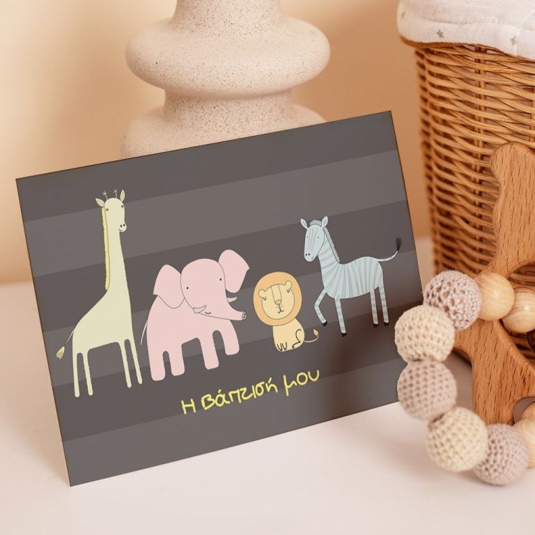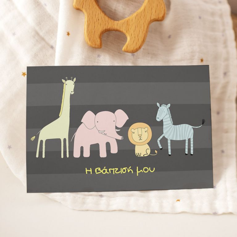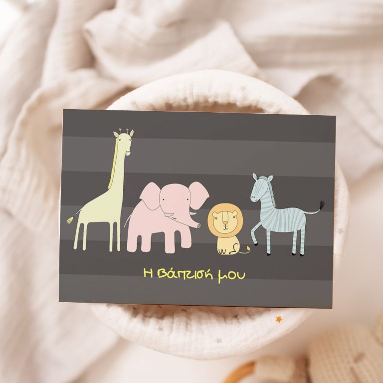 Κάθε λεπτομέρεια μετράει στην πιο όμορφη στιγμή της ζωής σας. Αυτό αντικατοπτρίζεται στα Προσκλητήρια Βάπτισης με σχέδιο Άγρια Ζωάκια, τα οποία χρησιμοποιούν υψηλής ποιότητας ιταλικό χαρτί και Myikona High Definition εκτύπωση. Διαθέσιμα σε διαφορετικές διαστάσεις.