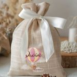 Μπομπονιέρες Βάπτισης με Πουγκί από Καμβά σε Εκρού Χρώμα με σχέδιο Ροζ Αερόστατο