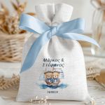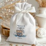 Μπομπονιέρες Βάπτισης με Πουγκί από Καμβά σε Λευκό Χρώμα με σχέδιο Δίδυμα Αρκουδάκια Ναύτες
