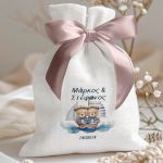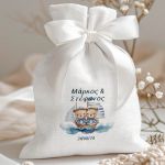Μπομπονιέρες Βάπτισης Πουγκί σε Λευκό Χρώμα με Σχέδιο Δίδυμα Αρκουδάκια Ναύτες