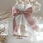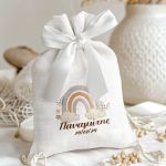 Μπομπονιέρες Βάπτισης με Πουγκί από Καμβά σε Λευκό Χρώμα με σχέδιο Ουράνιο Τόξο με Αστεράκια