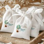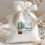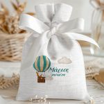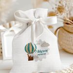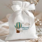 Μπομπονιέρες Βάπτισης με Πουγκί από Καμβά σε Λευκό Χρώμα με σχέδιο Ζωάκια στον Ουρανό