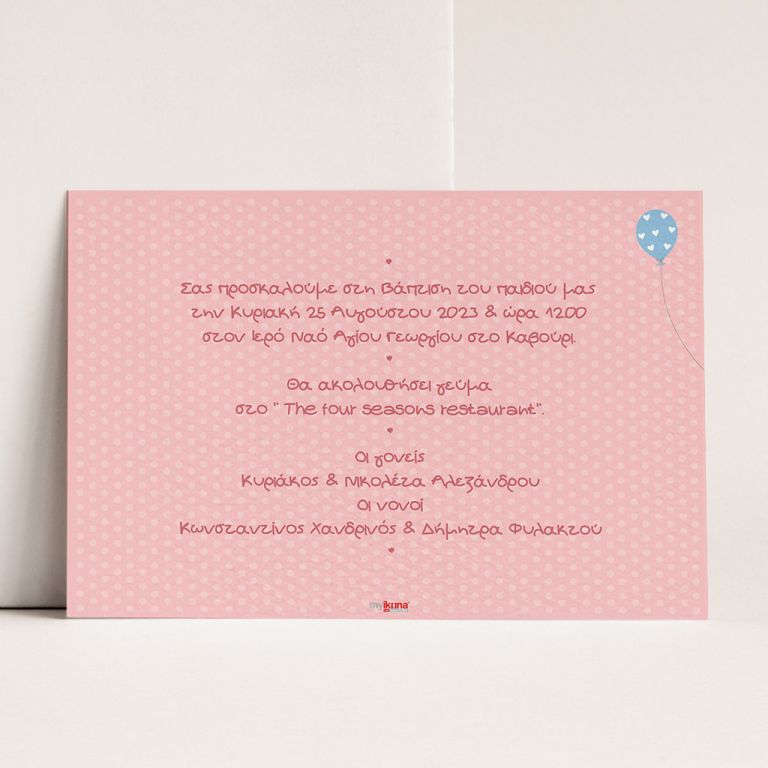 Δημιουργήστε μια πρόσκληση με τα στοιχεία σας και επιλέξτε ποσότητα 1 ώστε να δημιουργήσουμε ένα προσκλητήριο και να σας το αποστείλουμε πριν την τελική εκτύπωση με κόστος μόνο 9,95€.
