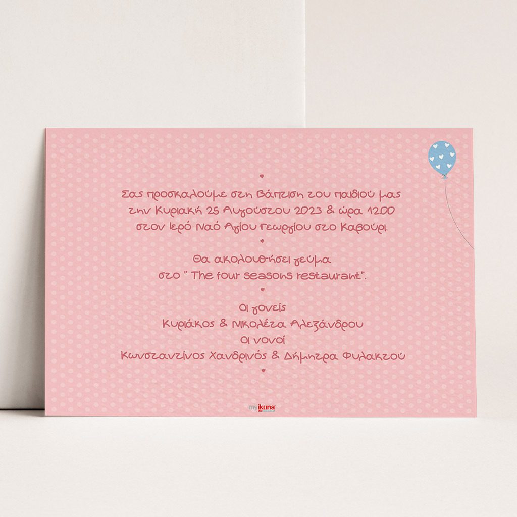 Δημιουργήστε μια πρόσκληση με τα στοιχεία σας και επιλέξτε ποσότητα 1 ώστε να δημιουργήσουμε ένα προσκλητήριο και να σας το αποστείλουμε πριν την τελική εκτύπωση με κόστος μόνο 9,95€.