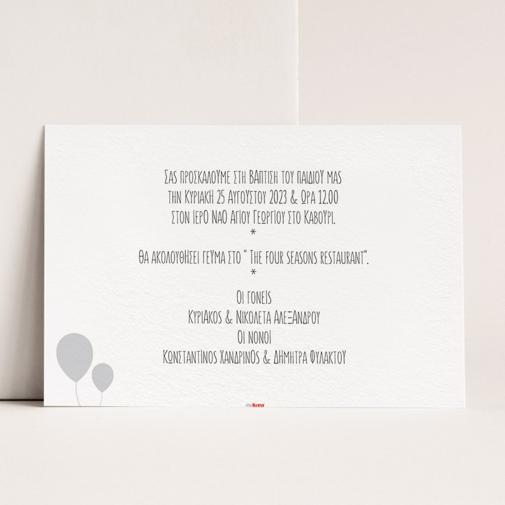 Κάθε λεπτομέρεια μετράει στην πιο όμορφη στιγμή της ζωής σας. Αυτό αντικατοπτρίζεται στα Προσκλητήρια Βάπτισης με σχέδιο Αρκουδάκι με Καφέ Μπαλόνια, τα οποία χρησιμοποιούν υψηλής ποιότητας ιταλικό χαρτί και Myikona High Definition εκτύπωση. Διαθέσιμα σε διαφορετικές διαστάσεις.