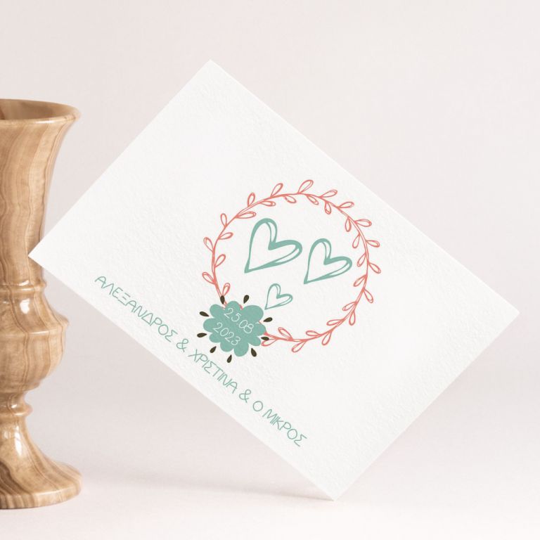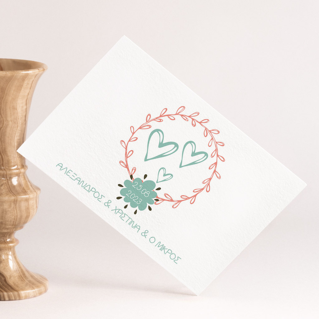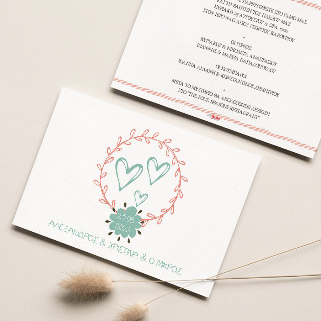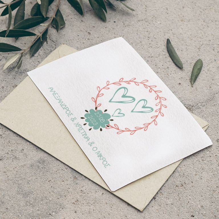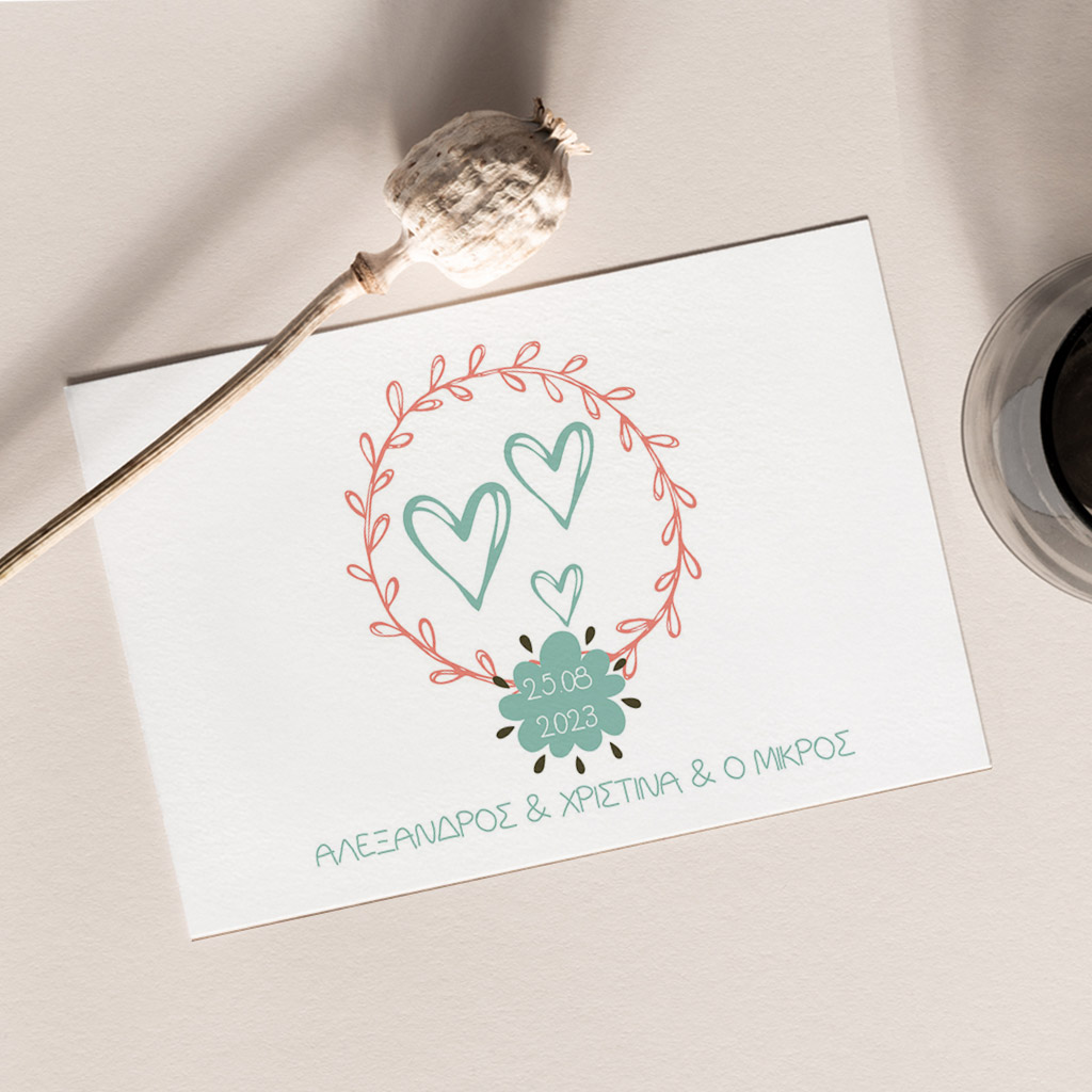 • Διακόσμηση & Σχεδίαση: Οι τρεις καρδούλες αποτελούν το σύμβολο του δεσμού και της αγάπης σας, κάνοντας το προσκλητήριό σας μια κομψή επιλογή για τη μοναδική σας στιγμή.