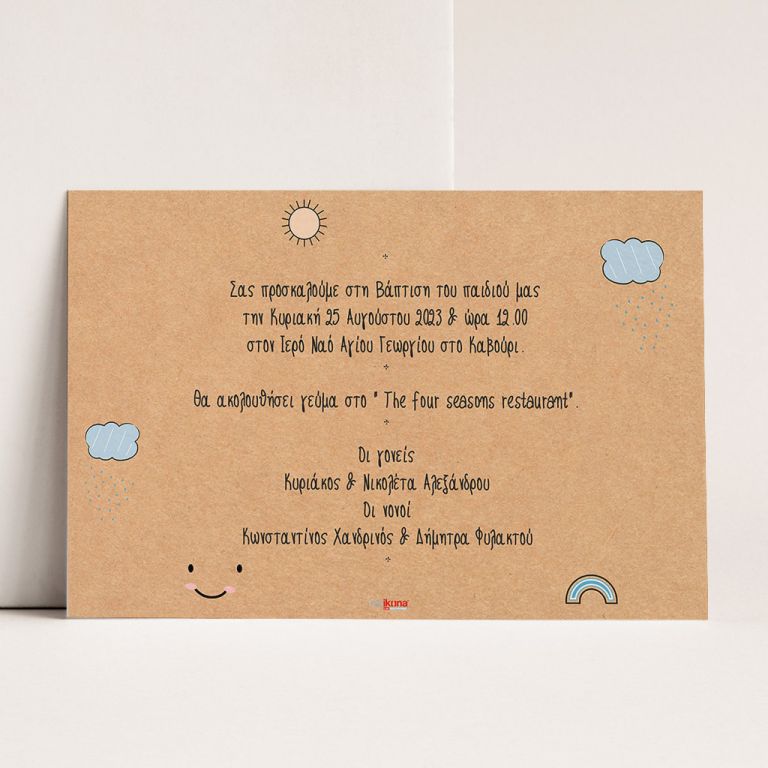 Κάθε λεπτομέρεια μετράει στην πιο όμορφη στιγμή της ζωής σας. Αυτό αντικατοπτρίζεται στα Προσκλητήρια Βάπτισης με σχέδιο Λιονταράκι στο Δάσος, τα οποία χρησιμοποιούν υψηλής ποιότητας ιταλικό χαρτί και Myikona High Definition εκτύπωση. Διαθέσιμα σε διαφορετικές διαστάσεις.