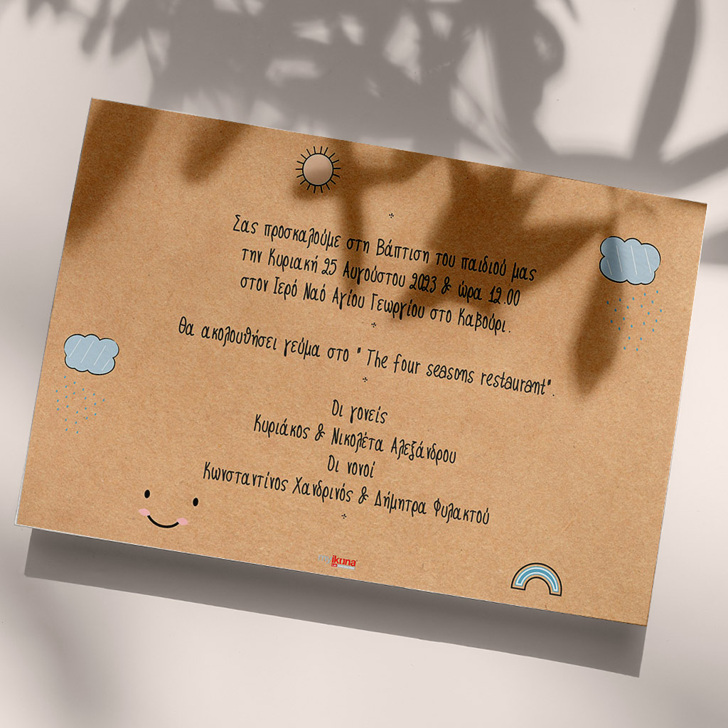 Κάθε λεπτομέρεια μετράει στην πιο όμορφη στιγμή της ζωής σας. Αυτό αντικατοπτρίζεται στα Προσκλητήρια Βάπτισης με σχέδιο Λιονταράκι στο Δάσος, τα οποία χρησιμοποιούν υψηλής ποιότητας ιταλικό χαρτί και Myikona High Definition εκτύπωση. Διαθέσιμα σε διαφορετικές διαστάσεις.