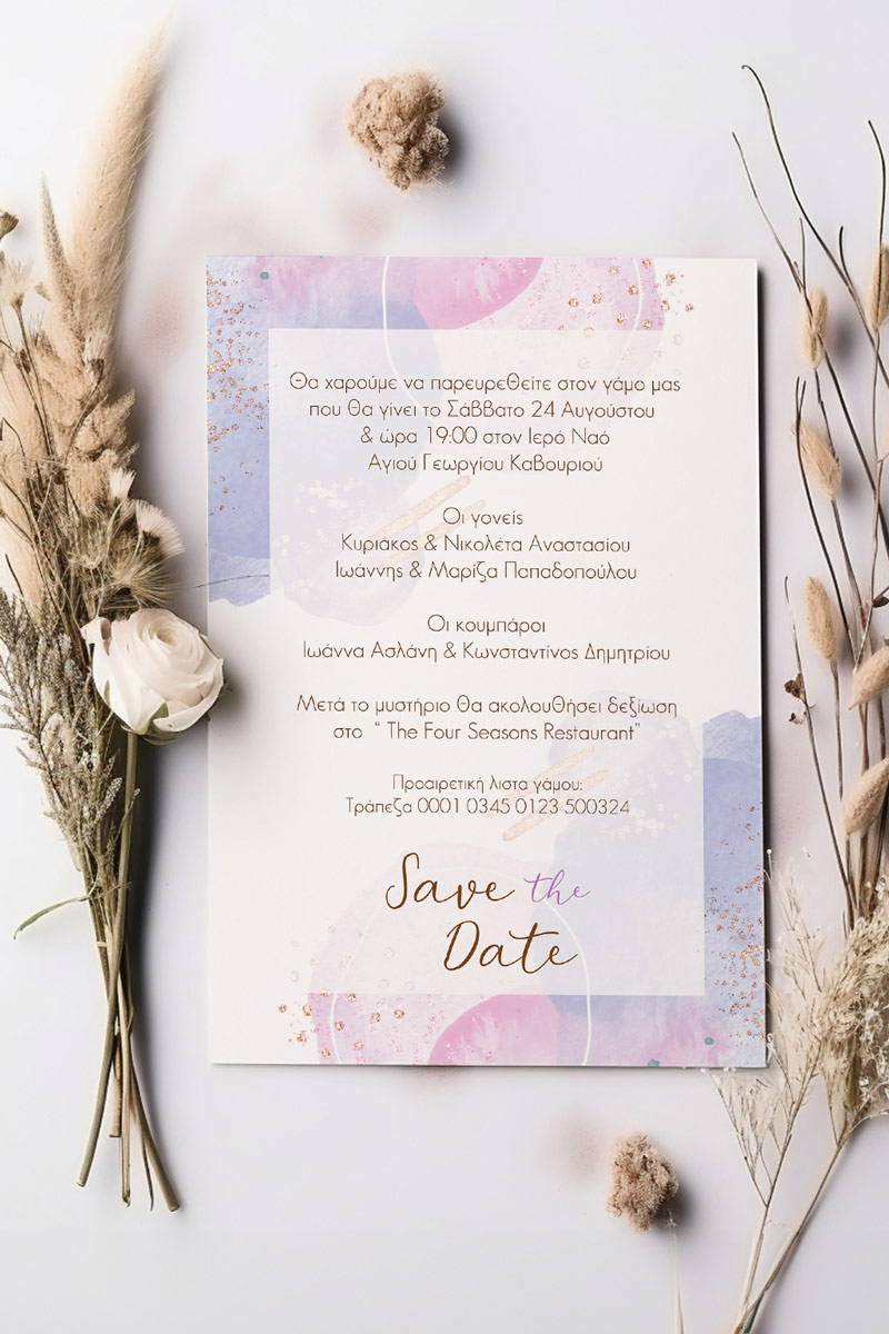 Επιλέξτε τον τύπο προσκλητηρίου που ταιριάζει στο προσωπικό σας στυλ: είτε μία κάρτα μεγέθους που διαλέγετε εσείς, είτε ένα πολύπτυχο που αναδιπλώνεται σαν ιστορία αγάπης, είτε ένα πάπυρο που θυμίζει αιώνιες υποσχέσεις.