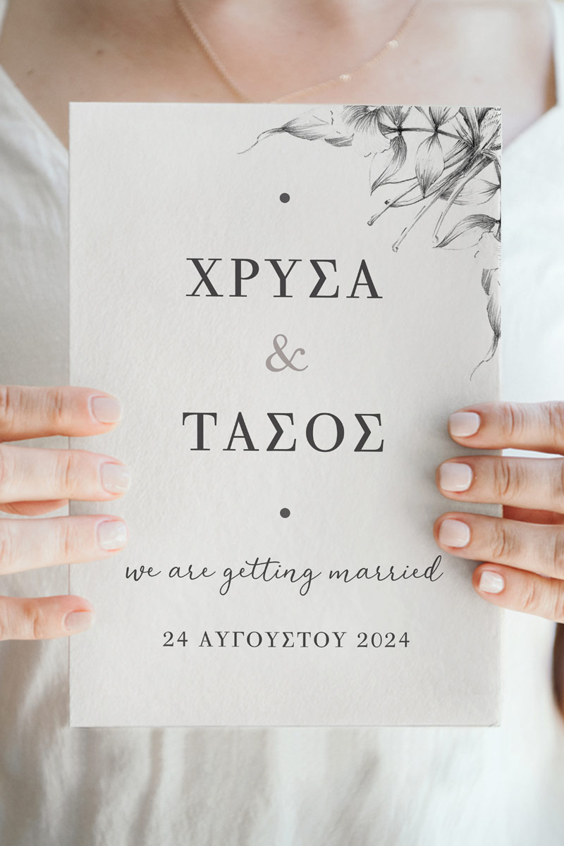 Αποκτήστε τα προσκλητήρια γάμου με σχέδιο Minimal Άνθη. Οι πελάτες μας τα ξεχωρίζουν για το υψηλής ποιότητας ιταλικό χαρτί και την εκτύπωση υψηλής ευκρίνειας Myikona High Definition. Διαθέσιμα σε διαφορετικές διαστάσεις.