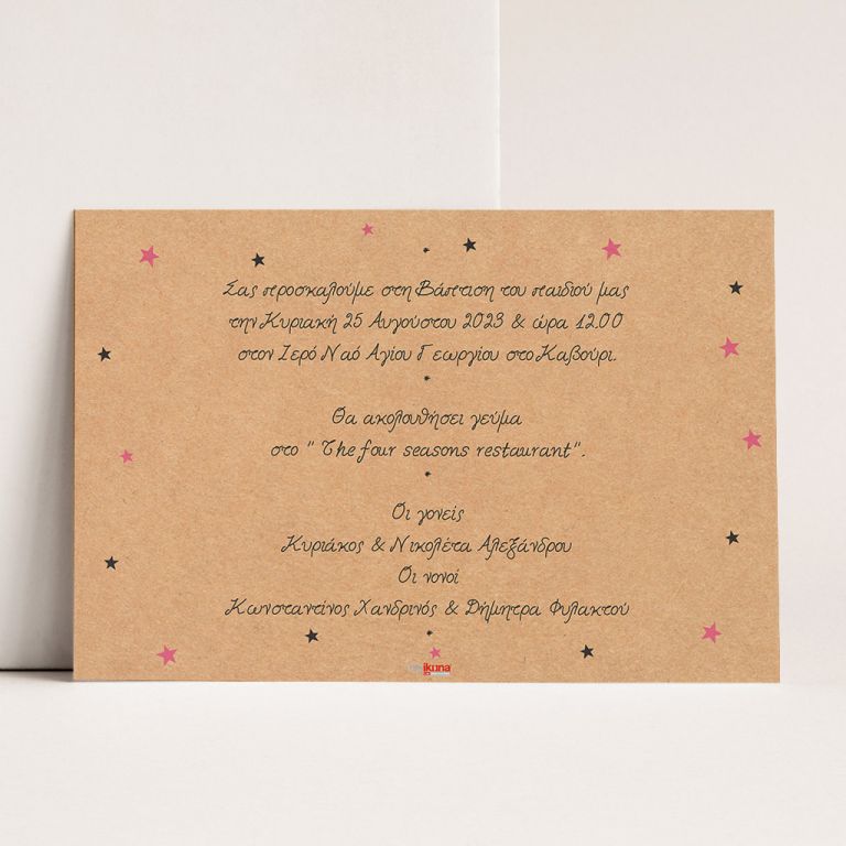 Δημιουργήστε ένα προσκλητήριο με τα στοιχεία σας και επιλέξτε ποσότητα 1 τεμαχίου, ώστε να το δημιουργήσουμε και να σας το αποστείλουμε πριν την τελική εκτύπωση με κόστος μόνο 9,95€.