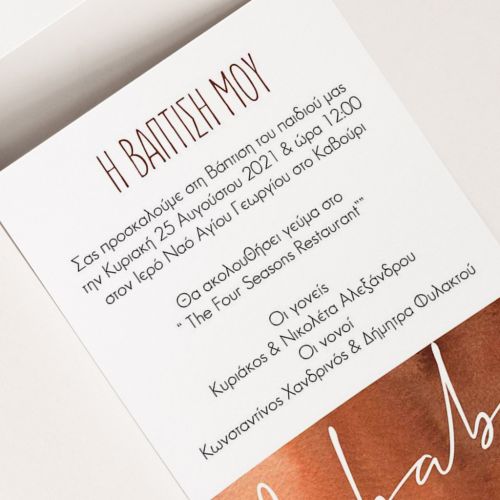 Με εξαιρετικές τιμές, υψηλή αισθητική και κορυφαία τεχνολογία εκτύπωσης, τα προσκλητήριά μας εγγυώνται ότι η πρόσκληση της βάπτισής σας θα αφήσει ένα ανεξίτηλο σημάδι στην καρδιά κάθε καλεσμένου.
