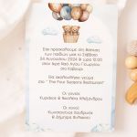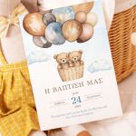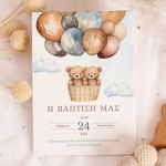 Κάθε λεπτομέρεια μετράει στην πιο όμορφη στιγμή της ζωής σας. Αυτό αντικατοπτρίζεται στα Προσκλητήρια Βάπτισης με σχέδιο Αρκουδάκι με Μπλε Μπαλόνια, τα οποία χρησιμοποιούν υψηλής ποιότητας ιταλικό χαρτί και Myikona High Definition εκτύπωση. Διαθέσιμα σε διαφορετικές διαστάσεις.