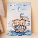 Κάθε λεπτομέρεια μετράει στην πιο όμορφη στιγμή της ζωής σας. Αυτό αντικατοπτρίζεται στα Προσκλητήρια Βάπτισης με σχέδιο Δίδυμα Αρκουδάκια Ναύτες, τα οποία χρησιμοποιούν υψηλής ποιότητας ιταλικό χαρτί και Myikona High Definition εκτύπωση. Διαθέσιμα σε διαφορετικές διαστάσεις.