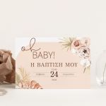 Κάθε λεπτομέρεια μετράει στην πιο όμορφη στιγμή της ζωής σας. Αυτό αντικατοπτρίζεται στα Προσκλητήρια Βάπτισης με σχέδιο Ροζ Boho Λουλούδια, τα οποία χρησιμοποιούν υψηλής ποιότητας ιταλικό χαρτί και Myikona High Definition εκτύπωση. Διαθέσιμα σε διαφορετικές διαστάσεις.
