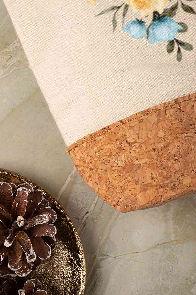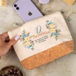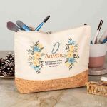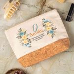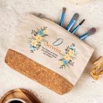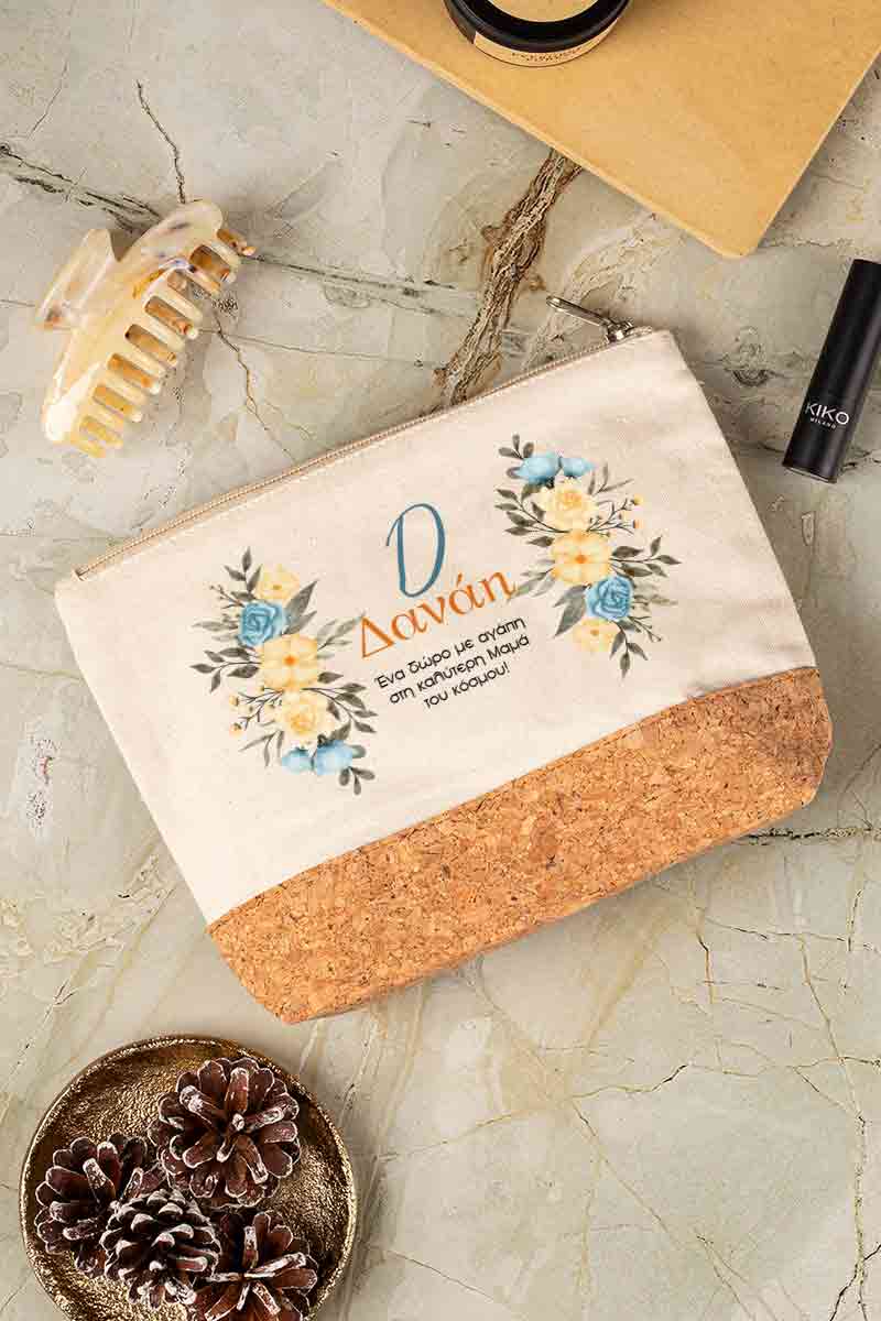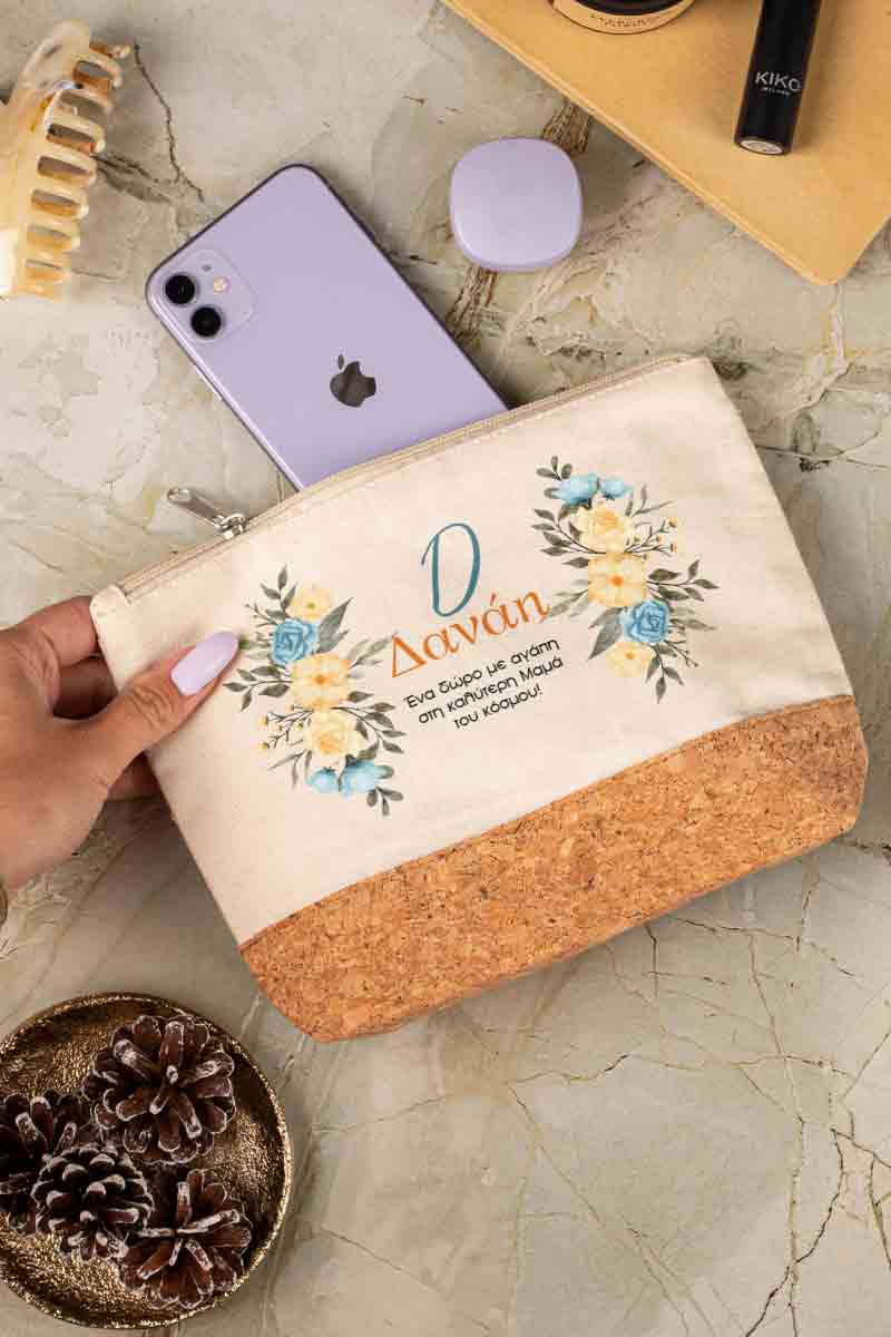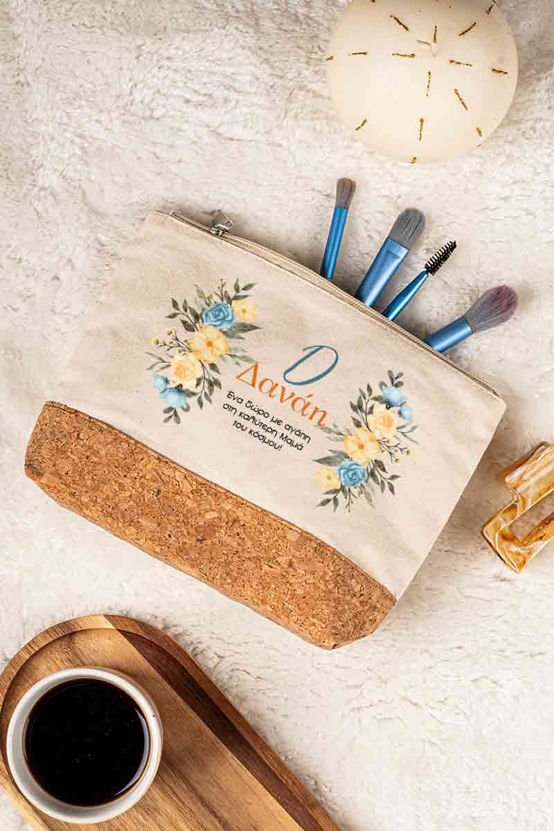 Προσωποποιημένο Εκρού Τσαντάκι & Νεσεσέρ Καλλυντικών με φελλό Κίτρινα και Μπλε Λουλούδια