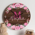 Ρολόι Τοίχου Ξύλινο με Όνομα και Σχέδιο Τριανταφυλλένιο μπουκέτο