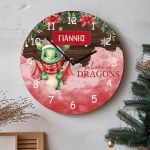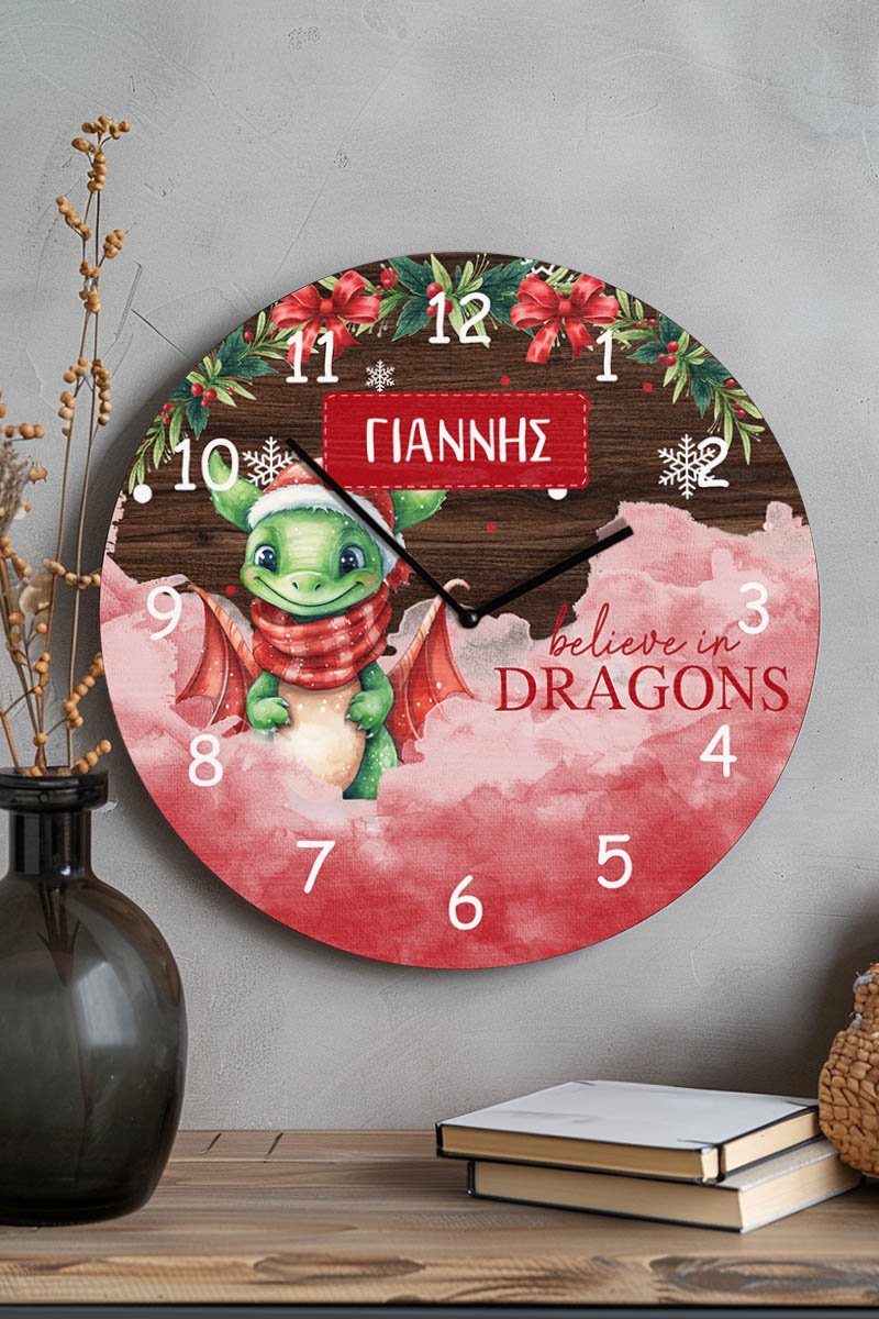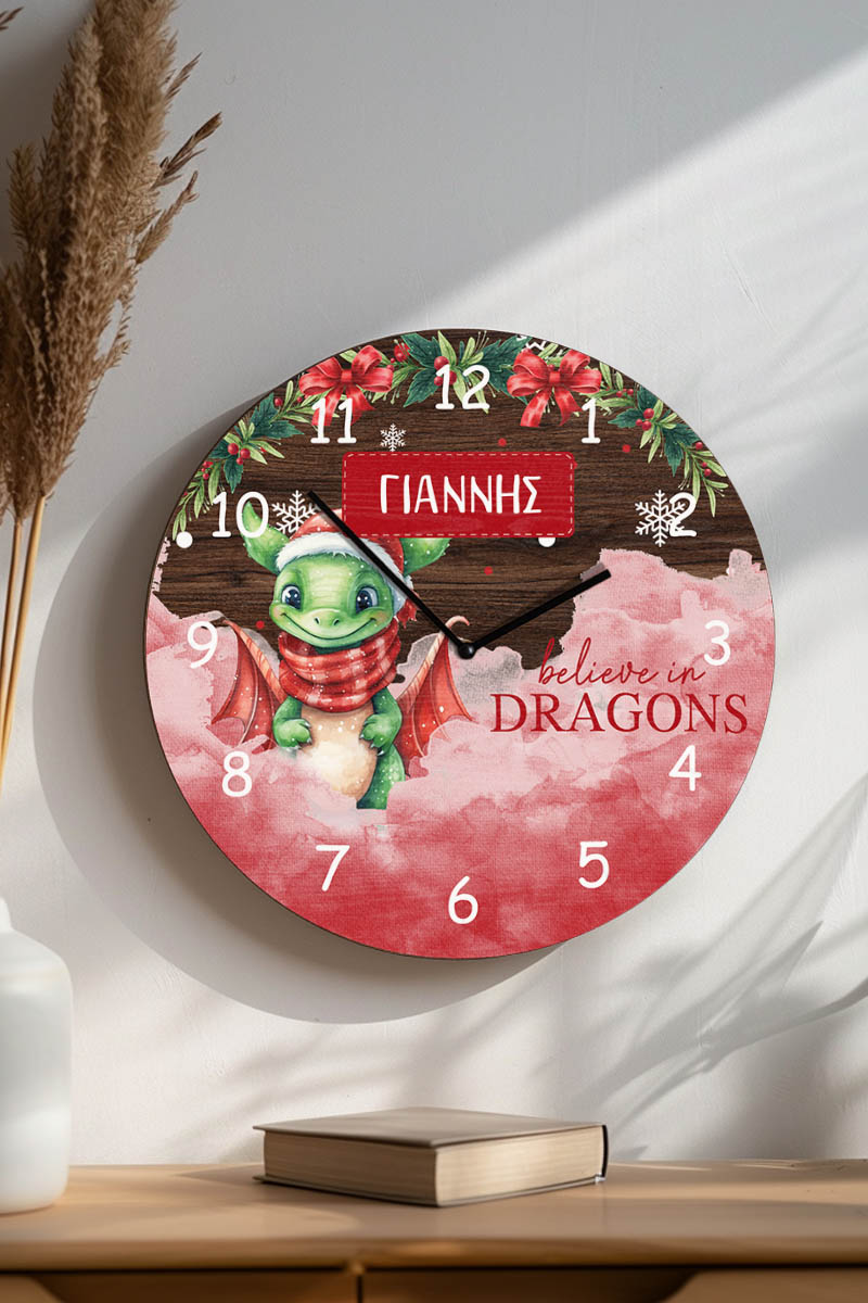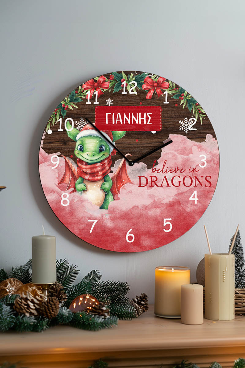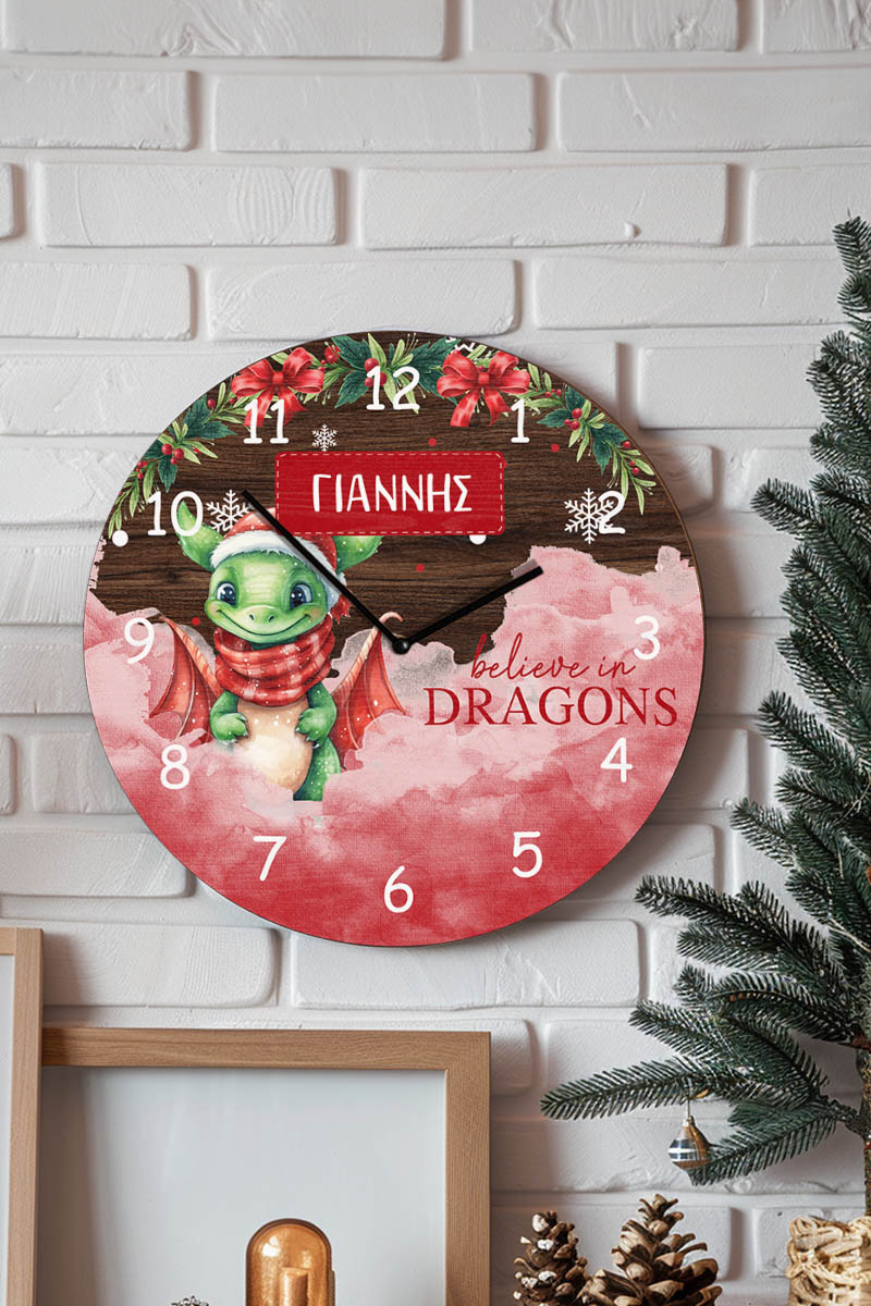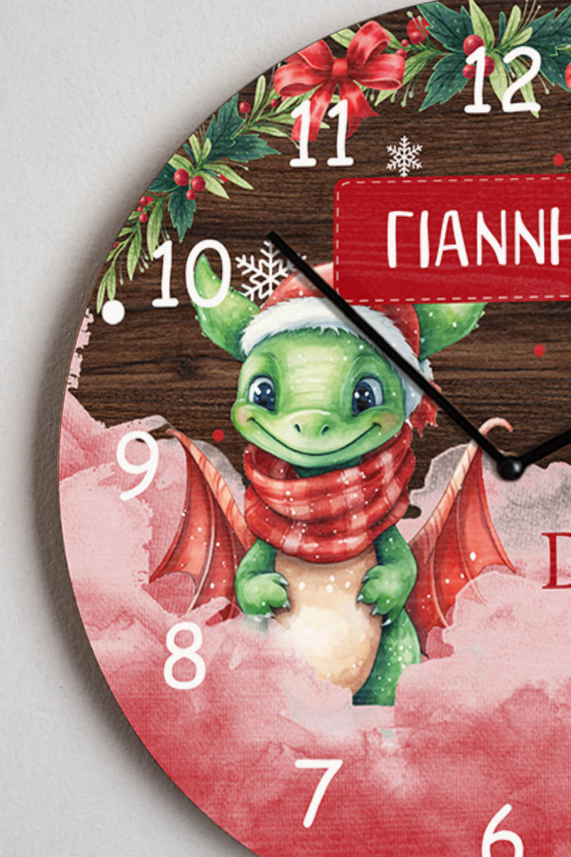 Χριστουγεννιάτικο Ρολόι Τοίχου Ξύλινο με Όνομα και Σχέδιο Δράκος